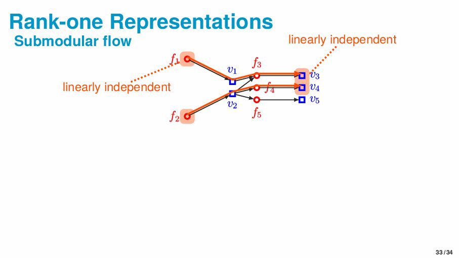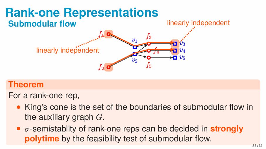 f5 v3 v4 v5 linearly independent linearly independent Theorem For a rank-one rep, • King’s cone is the set of the boundaries of submodular flow in the auxiliary graph G. • σ-semistablity of rank-one reps can be decided in strongly polytime by the feasibility test of submodular flow. 33 / 34