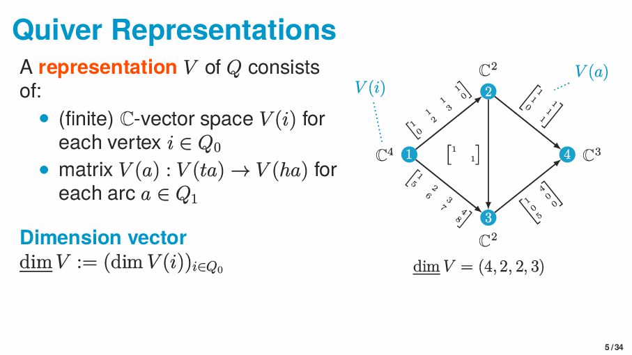 (finite) C-vector space V (i) for each vertex i ∈ Q0 • matrix V (a) : V (ta) → V (ha) for each arc a ∈ Q1 Dimension vector dim V := (dim V (i))i∈Q0 1 2 3 4 1 1 1 1 0 2 3 0 1 2 3 4 5 6 7 8 1 1 1 4 0 0 5 0 1 1 1 1 0 1 C4 C2 C2 C3 V (i) V (a) dim V = (4, 2, 2, 3) 5 / 34