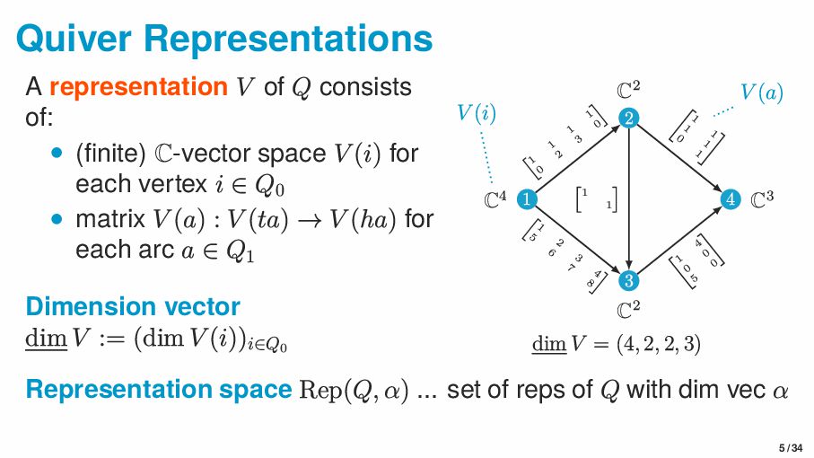 (finite) C-vector space V (i) for each vertex i ∈ Q0 • matrix V (a) : V (ta) → V (ha) for each arc a ∈ Q1 Dimension vector dim V := (dim V (i))i∈Q0 1 2 3 4 1 1 1 1 0 2 3 0 1 2 3 4 5 6 7 8 1 1 1 4 0 0 5 0 1 1 1 1 0 1 C4 C2 C2 C3 V (i) V (a) dim V = (4, 2, 2, 3) Representation space Rep(Q, α) ... set of reps of Q with dim vec α 5 / 34