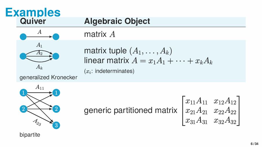 linear system: King’s criterion A rep V of an acyclic quiver is σ-semistable ⇐⇒ σ(dim V ) = 0 and σ(dim W) ≤ 0 (W ≤ V ) σ(α) := i∈Q0 σ(i)α(i) W ≤ V means W is a subrep of V Example V : A1 . . . Ak , dim V = (n, n), σ = (1, −1) ←→ linear matrix A = k a=1 xa Aa dim W1 − dim W2 ≤ 0 (W1 ≤ Cn, k Aa W1 ≤ W2 ) 12 / 34