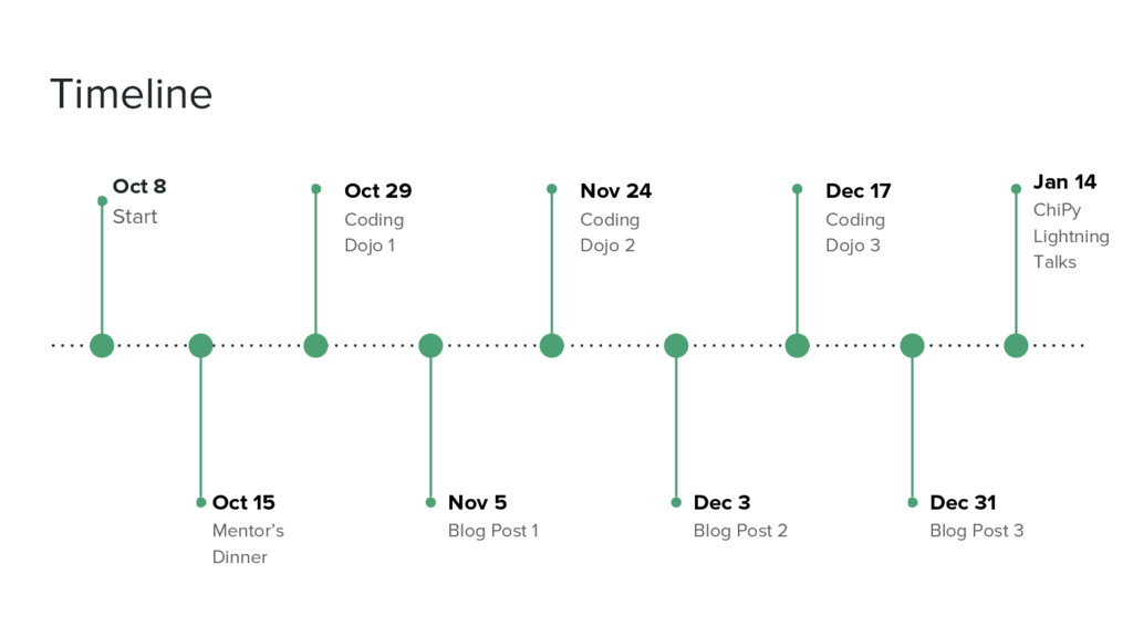 Coding Dojo 1 Nov 5 Blog Post 1 Nov 24 Coding Dojo 2 Dec 3 Blog Post 2 Dec 17 Coding Dojo 3 Dec 31 Blog Post 3 Jan 14 ChiPy Lightning Talks