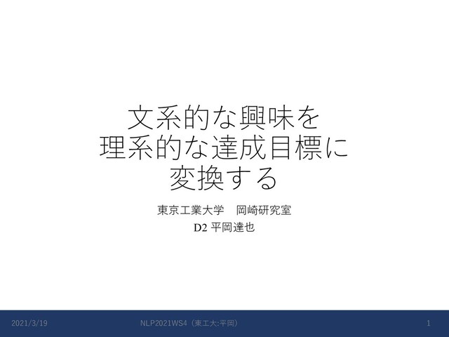 ⽂系的な興味を 理系的な達成⽬標に 変換する 東京⼯業⼤学 岡崎研究室 D2 平岡達也 2021/3/19 NLP2021WS4(東⼯⼤:平岡) 1