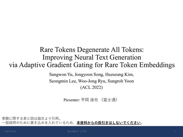 Di He, Xu Tan, Tao Qin, Liwei Wang, and TieYan Liu. Representation degeneration problem in training natural language generation models. ICLR 2019. Kakapo Cat 微妙な埋め込み表現 各埋め込みどうしの コサイン類似度が⼤きい トークンどうしの意味関係を捉えにくい 特定条件下で微妙な埋め込み表現が 学習されてしまう 埋め込み層を最終層としても活⽤する場合 (share-input-output-embed設定) Transformer Embedding Embedding <s> John loves John loves 同じ埋め込み層 を利⽤ Aysheaia