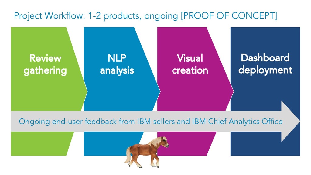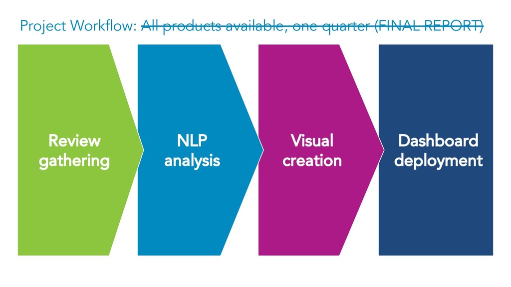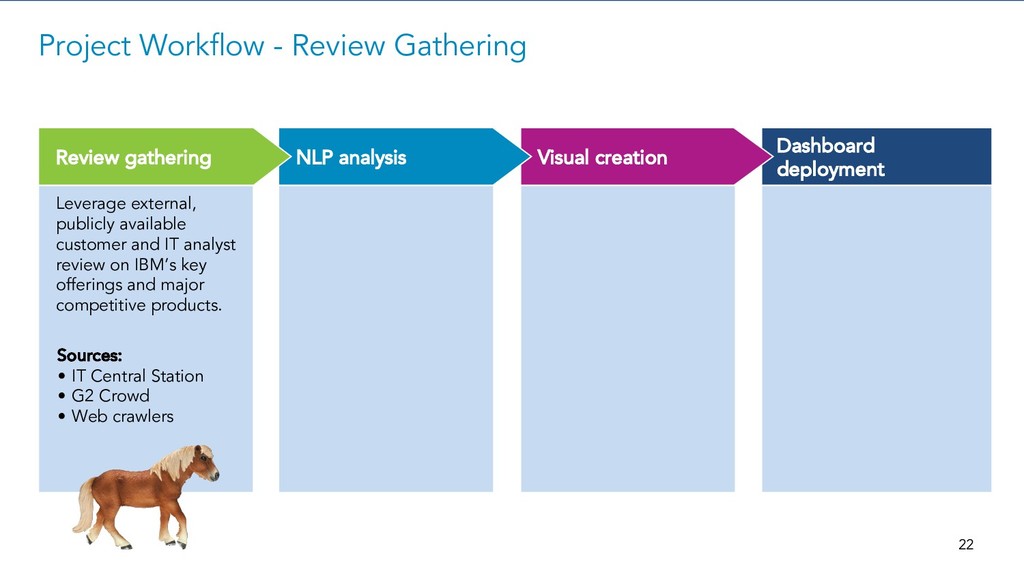 Dashboard deployment Leverage external, publicly available customer and IT analyst review on IBM’s key offerings and major competitive products. Visual creation NLP analysis Review gathering Project Workflow - Review Gathering Sources: • IT Central Station • G2 Crowd • Web crawlers 22