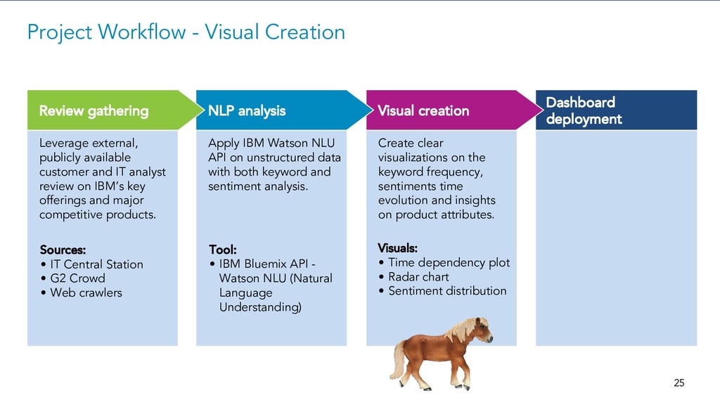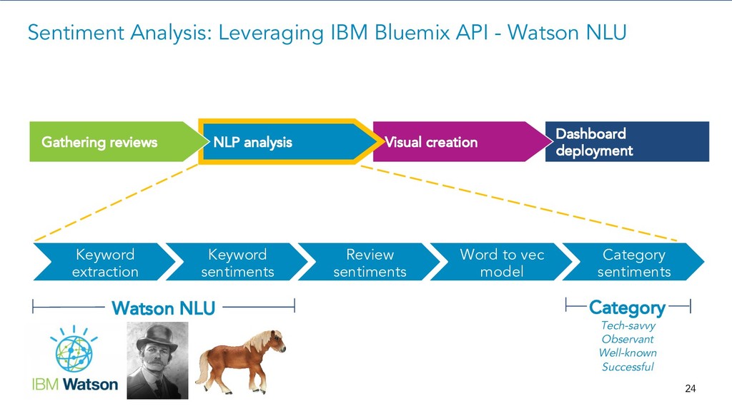 Apply IBM Watson NLU API on unstructured data with both keyword and sentiment analysis. Dashboard deployment Leverage external, publicly available customer and IT analyst review on IBM’s key offerings and major competitive products. Visual creation NLP analysis Review gathering Project Workflow - NLP Analysis Tool: • IBM Bluemix API - Watson NLU (Natural Language Understanding) Sources: • IT Central Station • G2 Crowd • Web crawlers 23