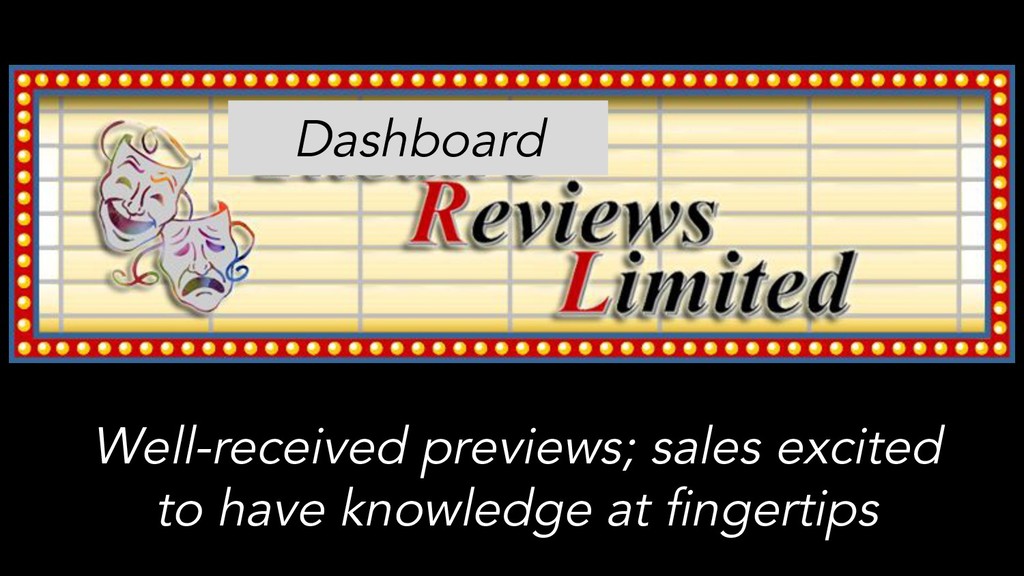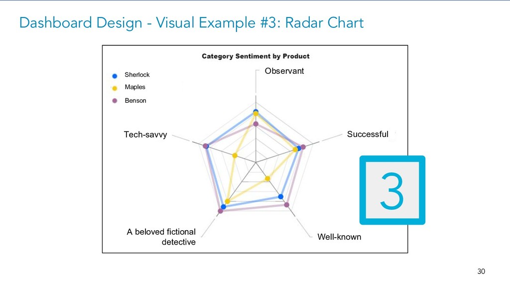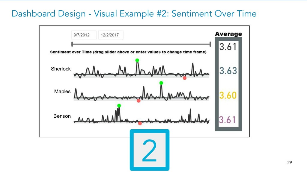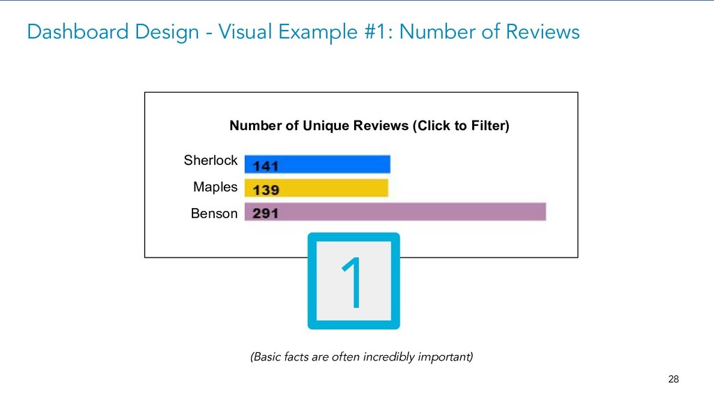 Dashboard Design - Visual Example #1: Number of Reviews Number of Unique Reviews (Click to Filter) IBM Cognos Power BI Tableau 1 28 (Basic facts are often incredibly important) Sherlock Maples Benson