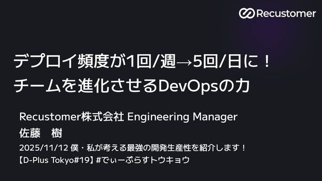 Recustomer株式会社 Engineering Manager 佐藤 樹 2025/11/12 僕・私が考える最強の開発生産性を紹介します! 【D-Plus Tokyo#19】 #でぃーぷらすトウキョウ デプロイ頻度が1回/週→5回/日に!