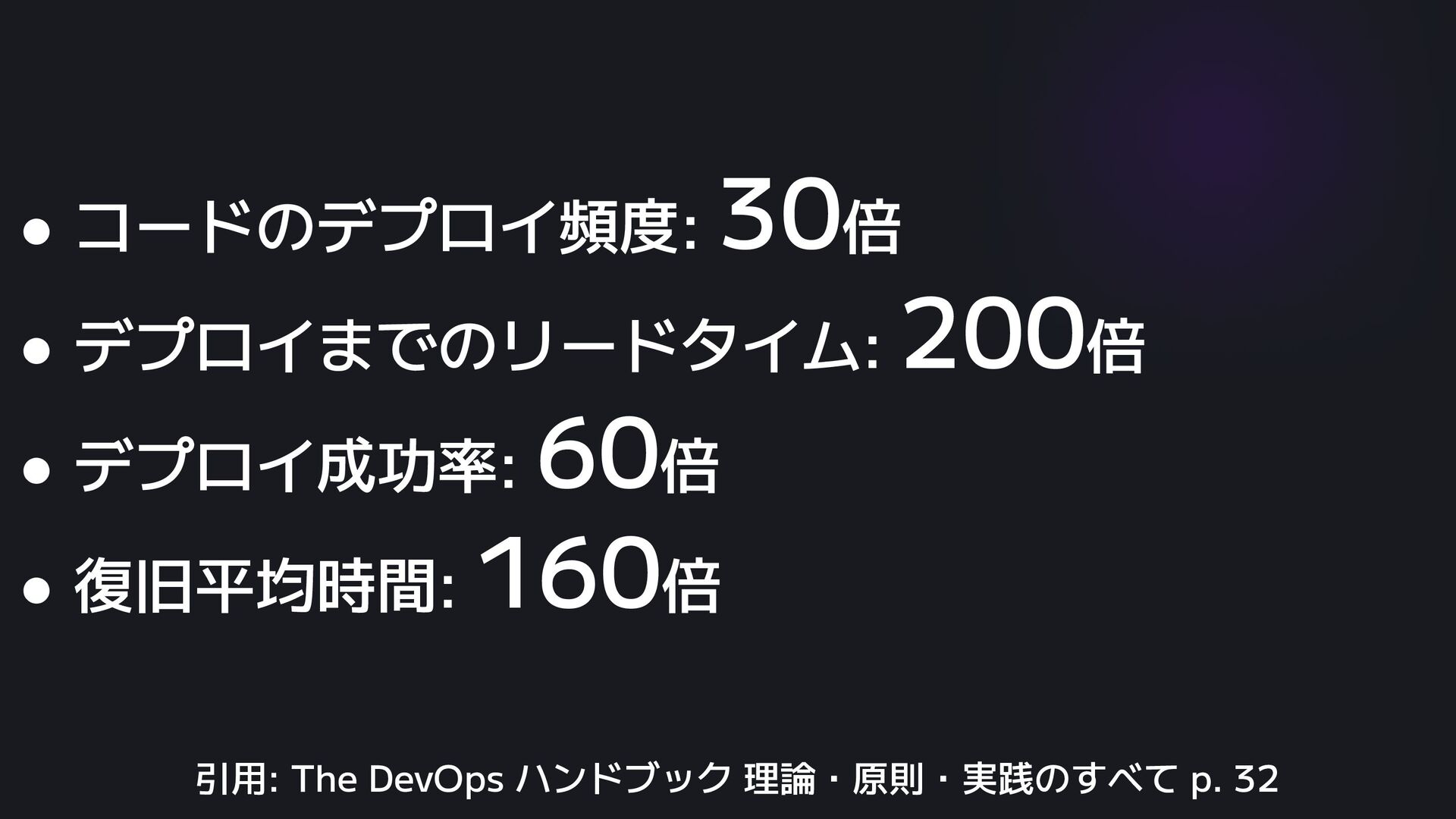 • デプロイまでのリードタイム: 200倍 • デプロイ成功率: 60倍 • 復旧平均時間: 160倍