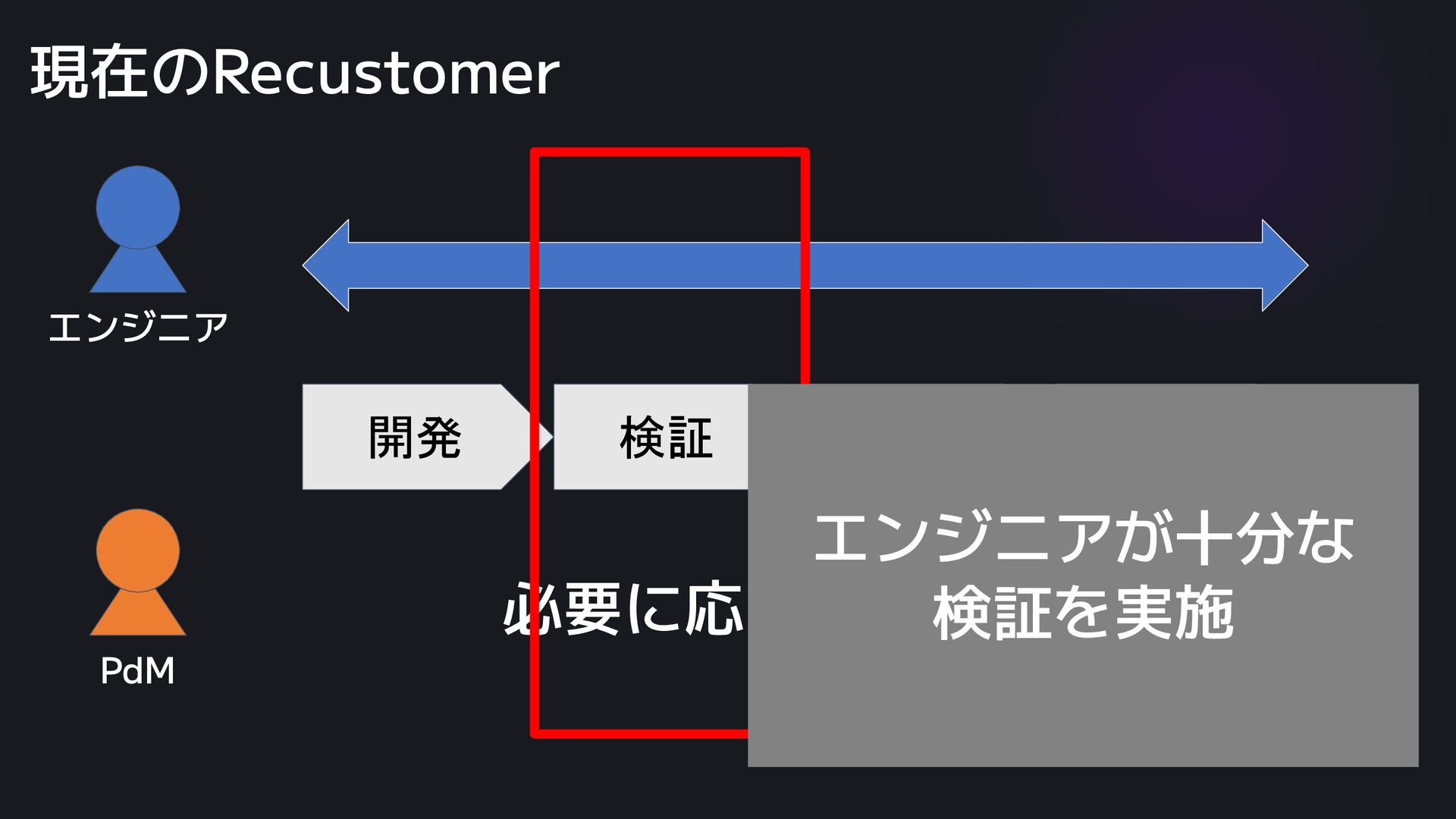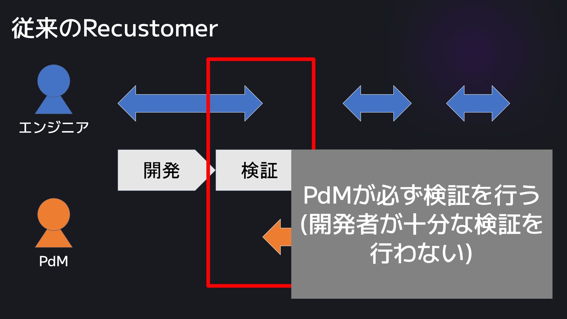 従来のRecustomer エンジニア 開発 検証 リリース 運用 PdM PdMが必ず検証を行う (開発者が十分な検証を 行わない)