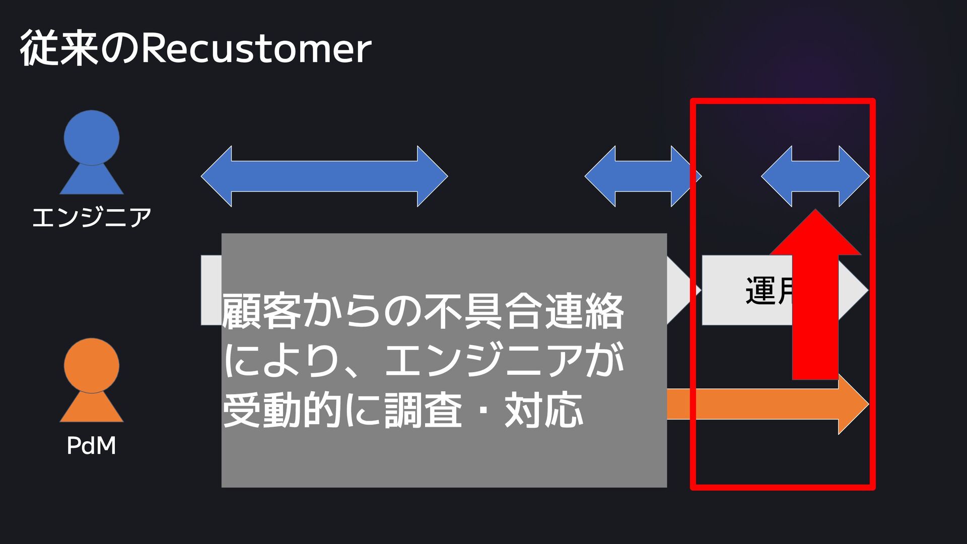 従来のRecustomer エンジニア 開発 検証 リリース 運用 PdM 顧客からの不具合連絡 により、エンジニアが 受動的に調査・対応