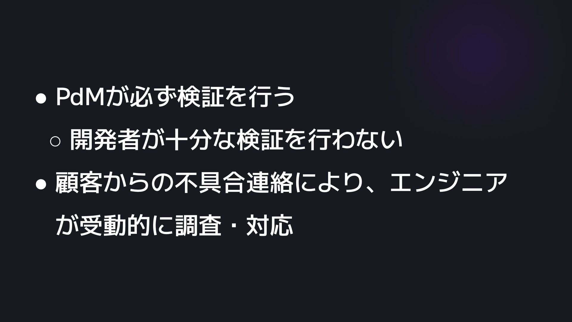• PdMが必ず検証を行う ◦ 開発者が十分な検証を行わない • 顧客からの不具合連絡により、エンジニア が受動的に調査・対応