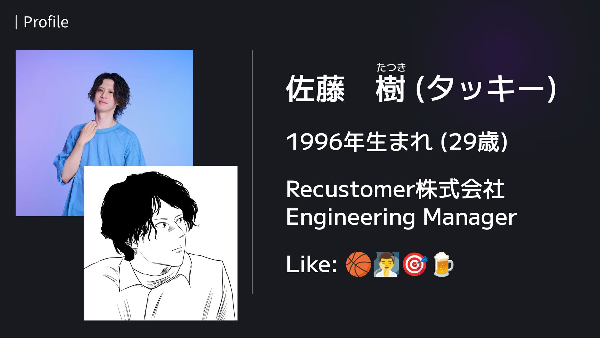 Profile 佐藤 樹 (タッキー) Recustomer株式会社 Engineering Manager たつき Like: 🏀🎯🍺 1996年生まれ
