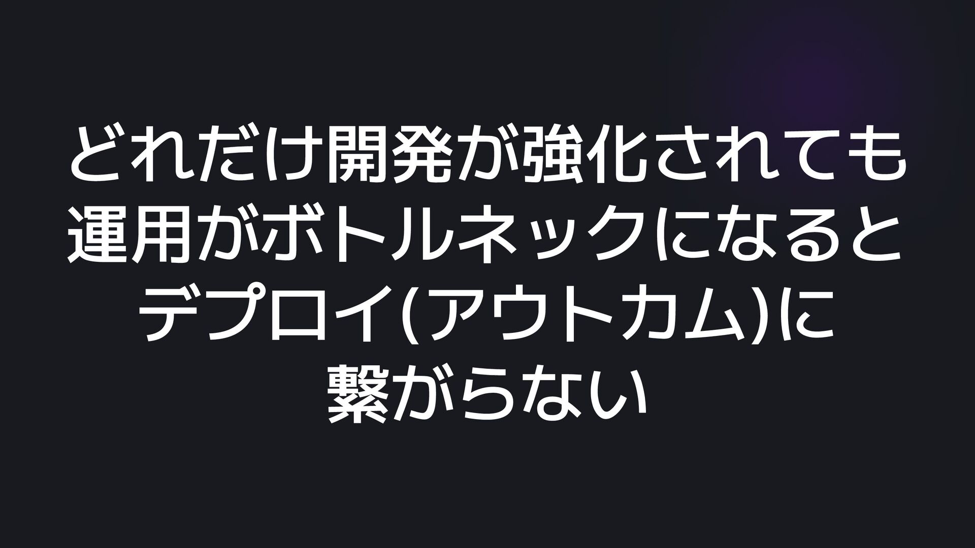 どれだけ開発が強化されても 運用がボトルネックになると デプロイ(アウトカム)に 繋がらない