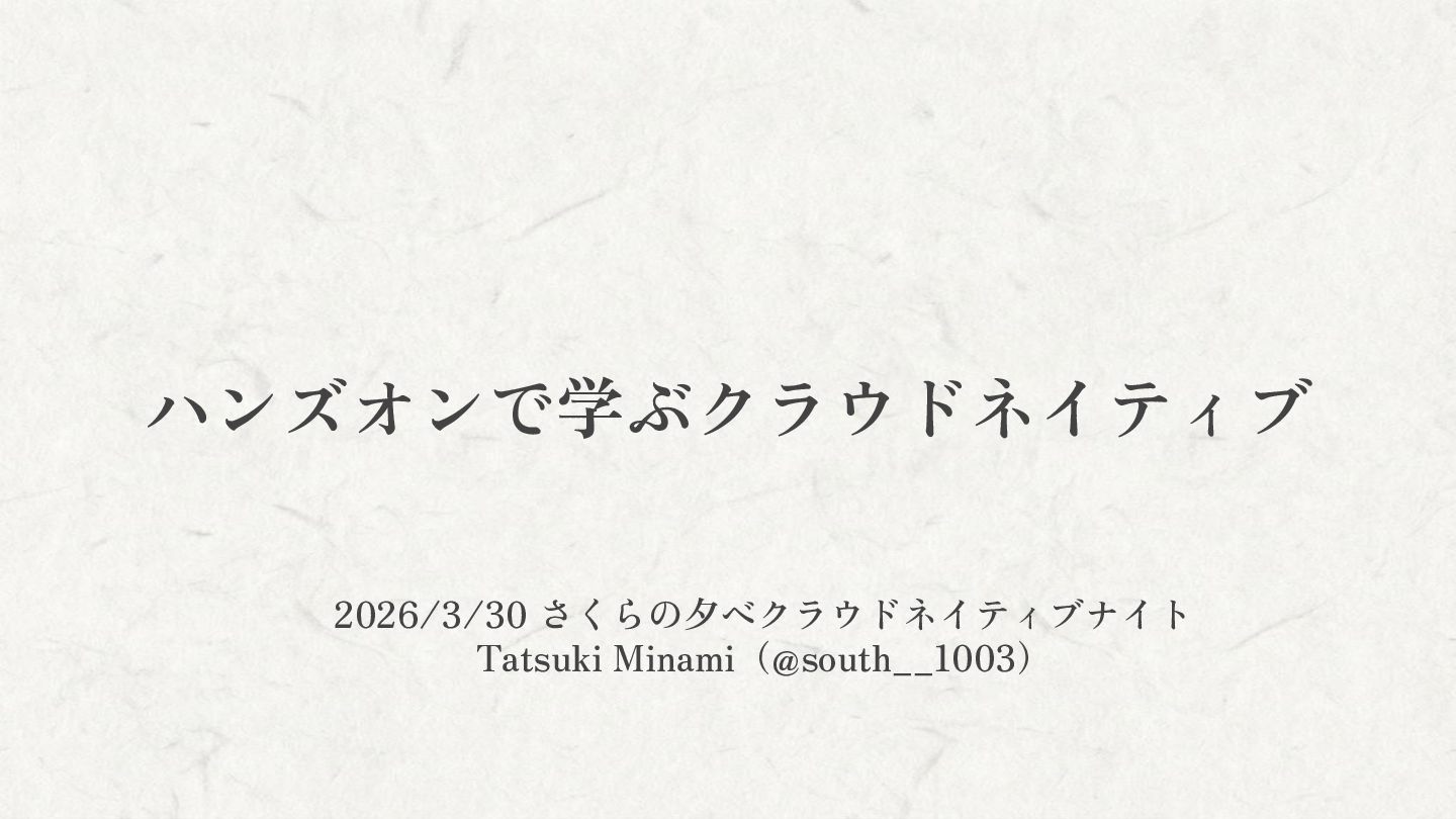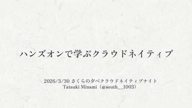 ハンズオンで学ぶクラウドネイティブ 2026/3/30 さくらの夕べクラウドネイティブナイト Tatsuki Minami(@south__1003)