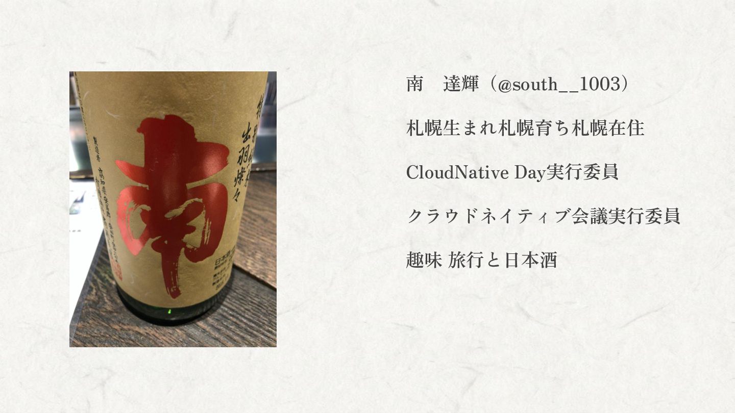 南 達輝(@south__1003) 札幌生まれ札幌育ち札幌在住 CloudNative Day実行委員 クラウドネイティブ会議実行委員 趣味 旅行と日本酒