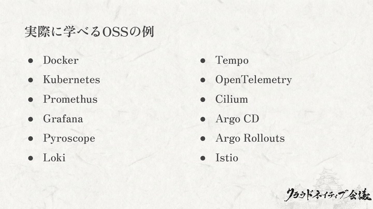 実際に学べるOSSの例 • Docker • Kubernetes • Promethus • Grafana •