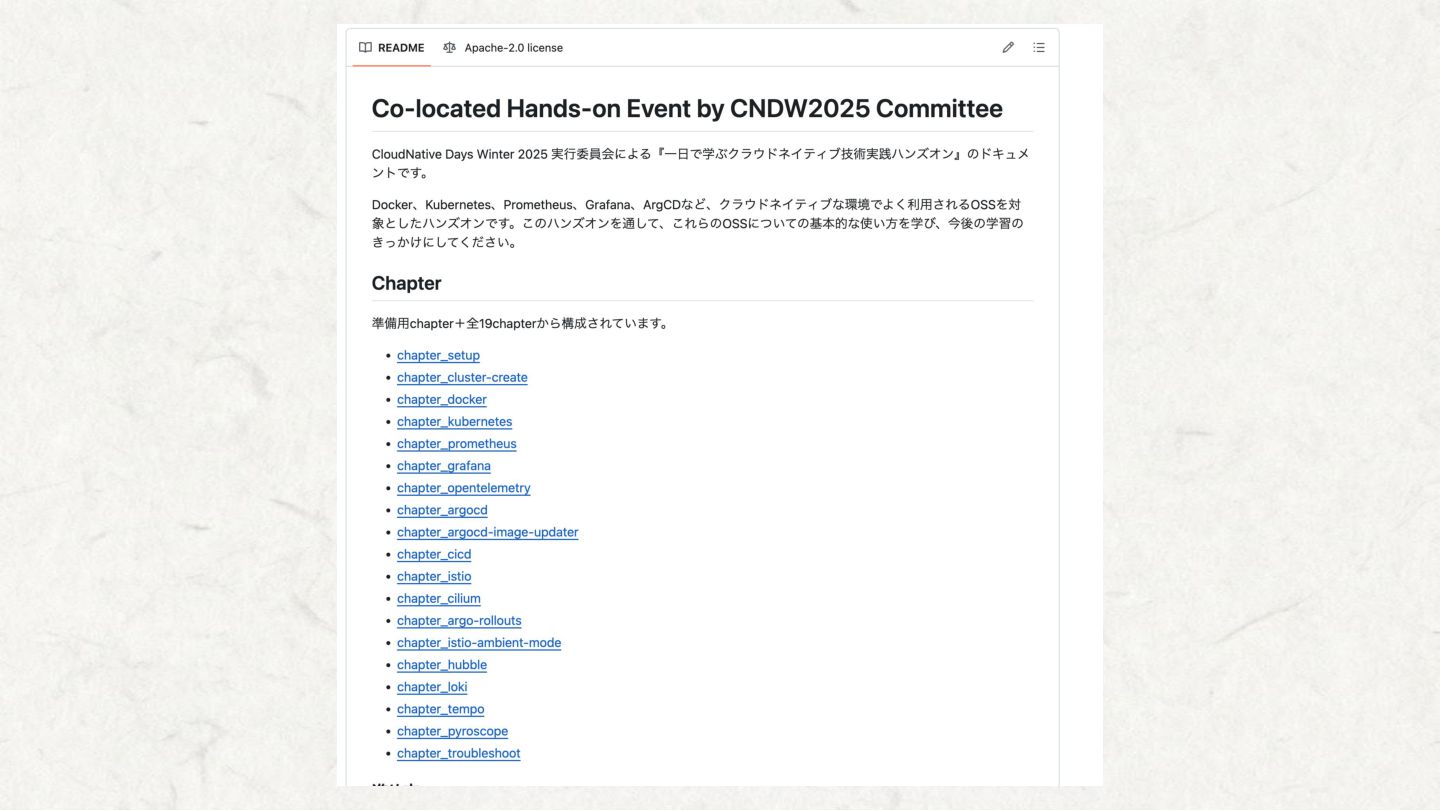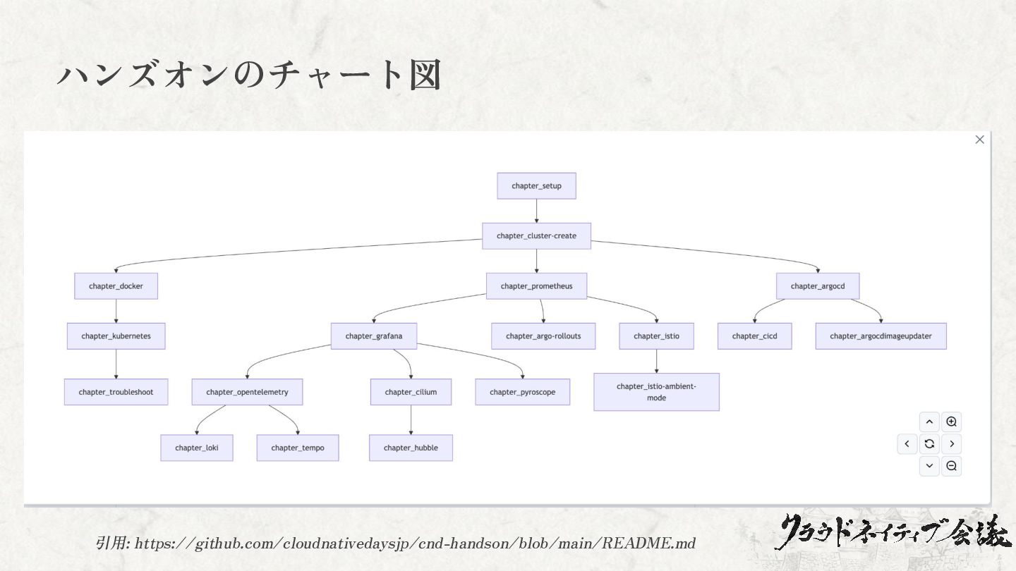 引用: https://github.com/cloudnativedaysjp/cnd-handson/blob/main/README.md ハンズオンのチャート図