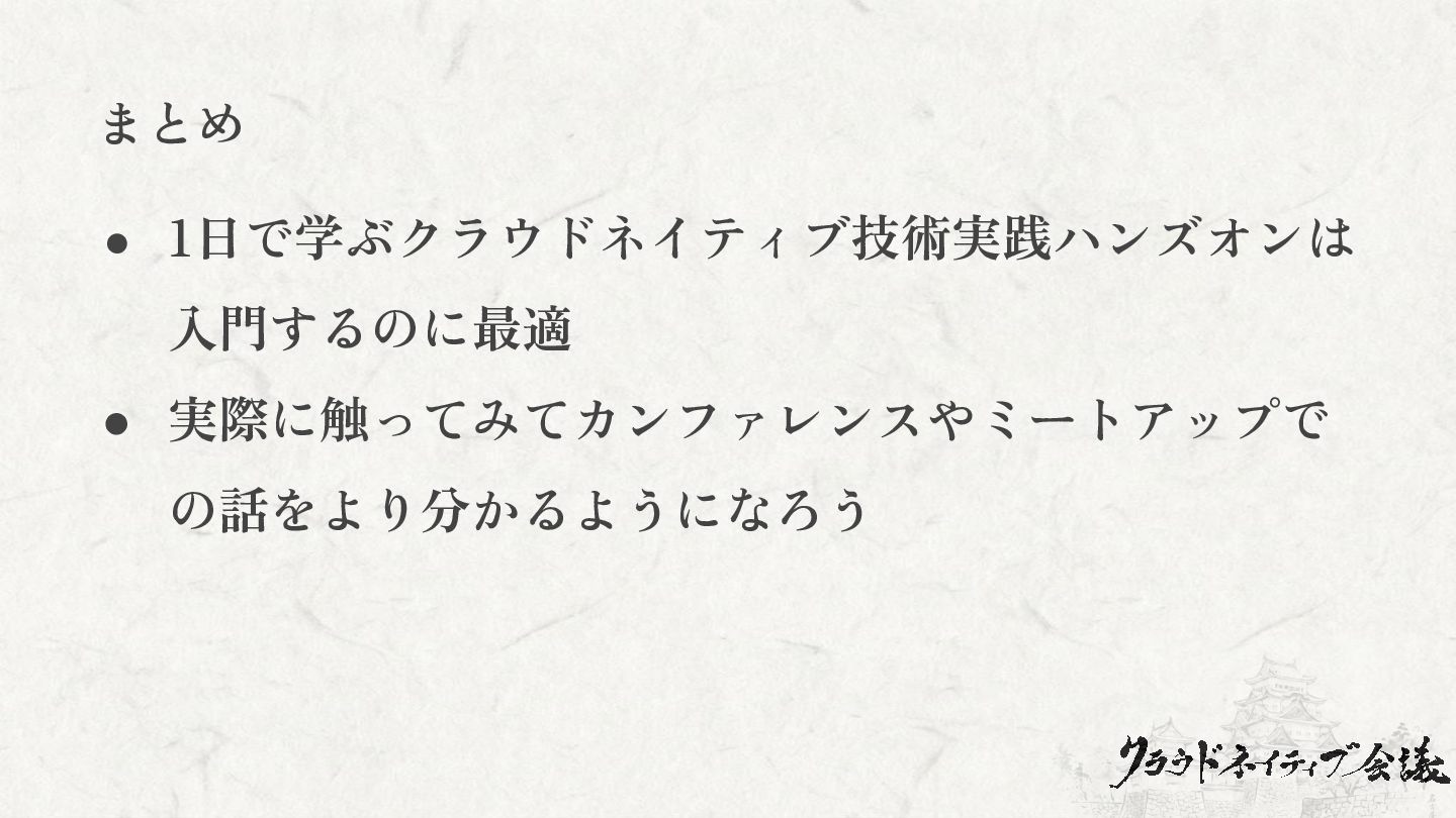 まとめ • 1日で学ぶクラウドネイティブ技術実践ハンズオンは 入門するのに最適 • 実際に触ってみてカンファレンスやミートアップで の話をより分かるようになろう