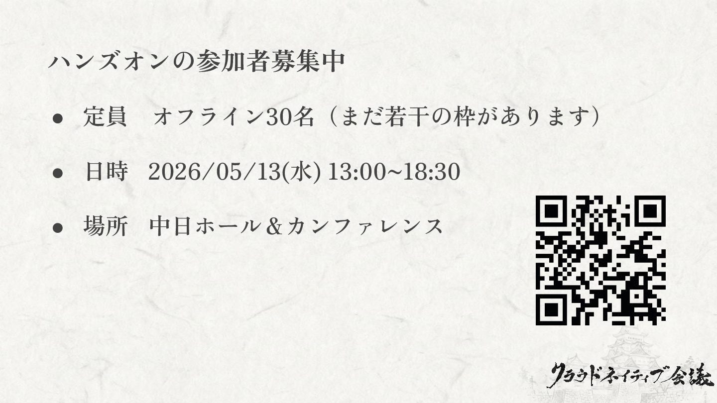 ハンズオンの参加者募集中 • 定員 オフライン30名(まだ若干の枠があります) • 日時 2026/05/13(水) 13:00~18:30 • 場所 中日ホール&カンファレンス