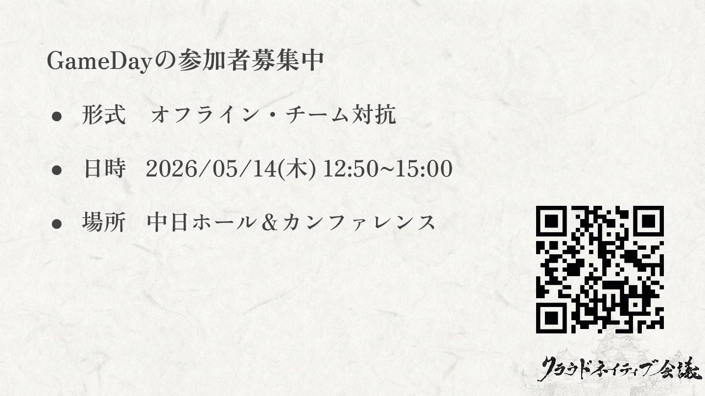 GameDayの参加者募集中 • 形式 オフライン・チーム対抗 • 日時 2026/05/14(木) 12:50~15:00 • 場所 中日ホール&カンファレンス