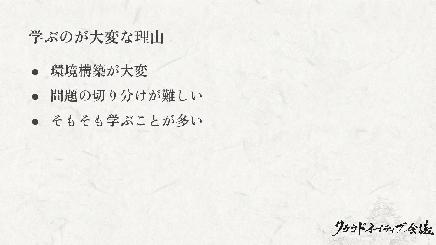 学ぶのが大変な理由 • 環境構築が大変 • 問題の切り分けが難しい • そもそも学ぶことが多い
