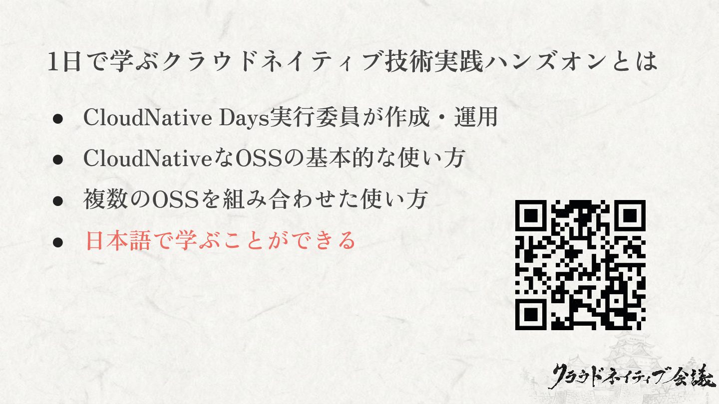 1日で学ぶクラウドネイティブ技術実践ハンズオンとは • CloudNative Days実行委員が作成・運用 • CloudNativeなOSSの基本的な使い方 • 複数のOSSを組み合わせた使い方 • 日本語で学ぶことができる
