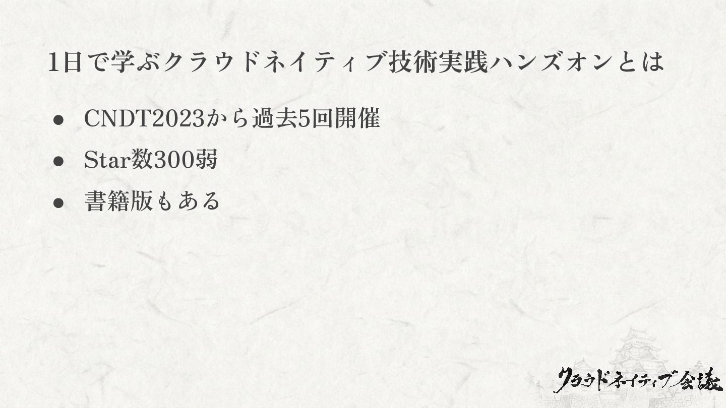 1日で学ぶクラウドネイティブ技術実践ハンズオンとは • CNDT2023から過去5回開催 • Star数300弱 • 書籍版もある