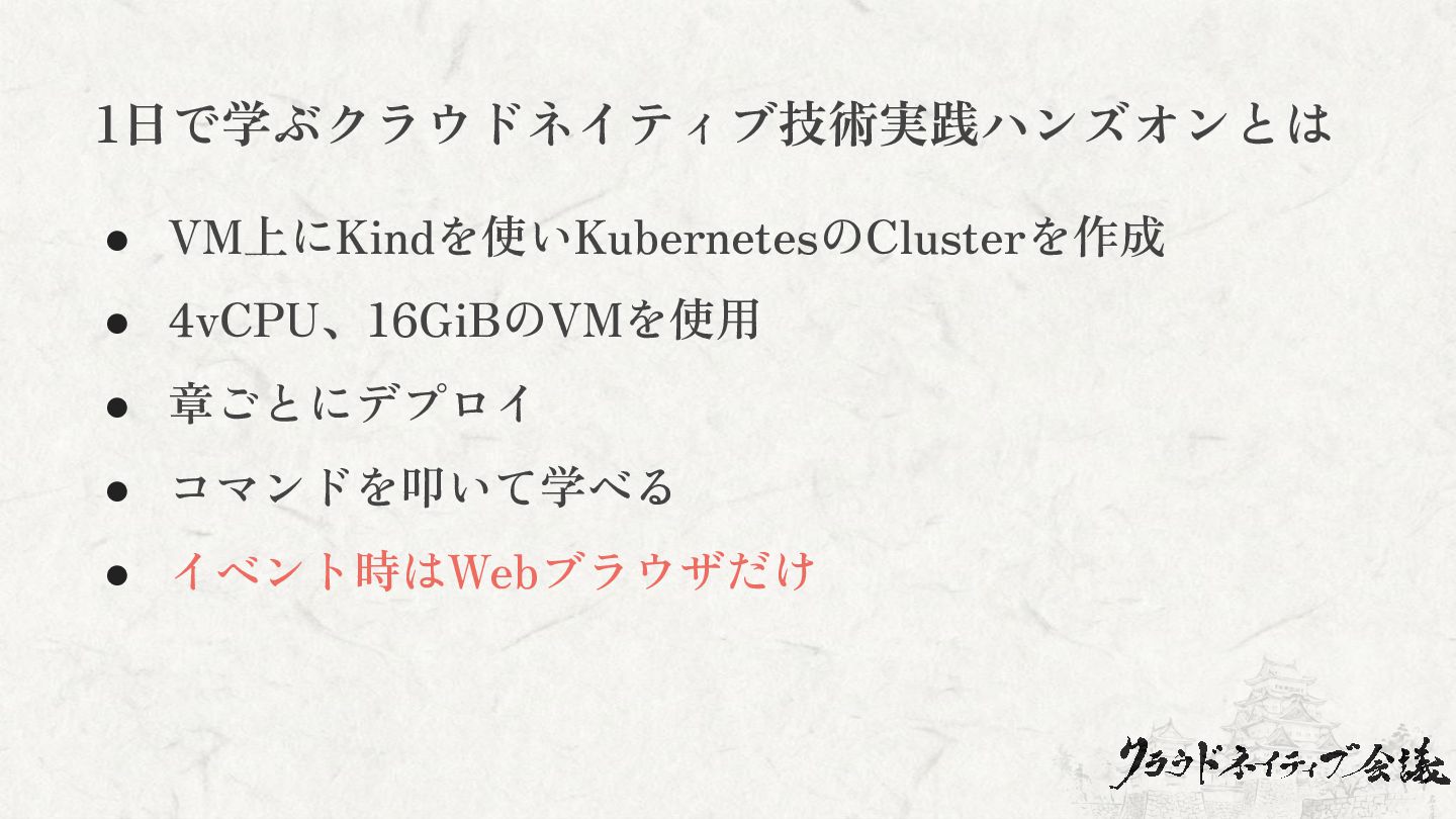 1日で学ぶクラウドネイティブ技術実践ハンズオンとは • VM上にKindを使いKubernetesのClusterを作成 • 4vCPU、16GiBのVMを使用 • 章ごとにデプロイ • コマンドを叩いて学べる •
