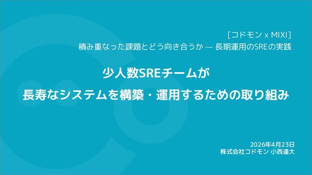 少人数SREチームが 長寿なシステムを構築・運用するための取り組み 2026年4月23日 株式会社コドモン 小西達大 [コドモン x MIXI] 積み重なった課題とどう向き合うか —