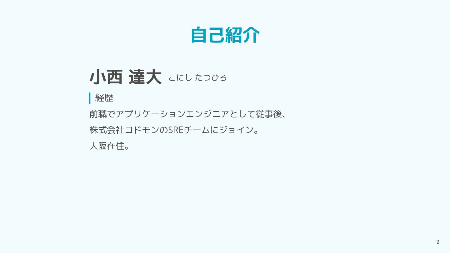 2 経歴 前職でアプリケーションエンジニアとして従事後、 株式会社コドモンのSREチームにジョイン。 大阪在住。 自己紹介 小西 達大 こにし たつひろ