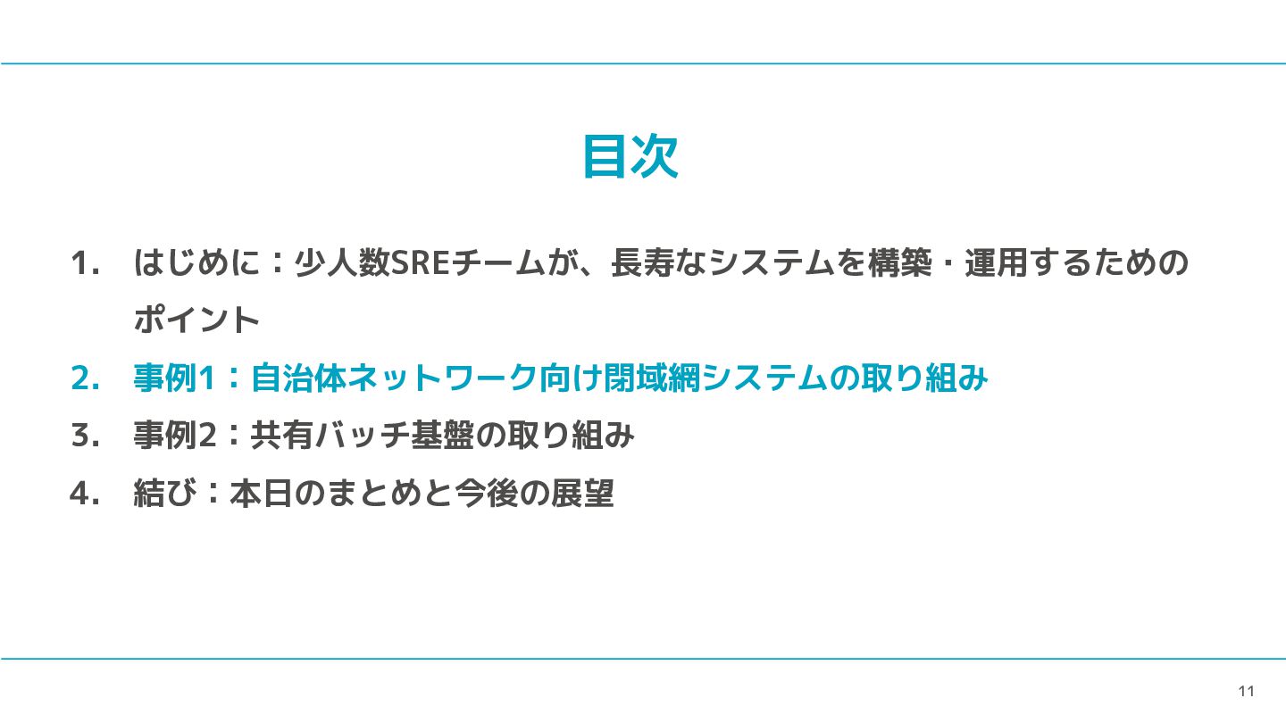 11 目次 1. はじめに:少人数SREチームが、長寿なシステムを構築・運用するための ポイント 2. 事例1:自治体ネットワーク向け閉域網システムの取り組み 3. 事例2:共有バッチ基盤の取り組み 4.