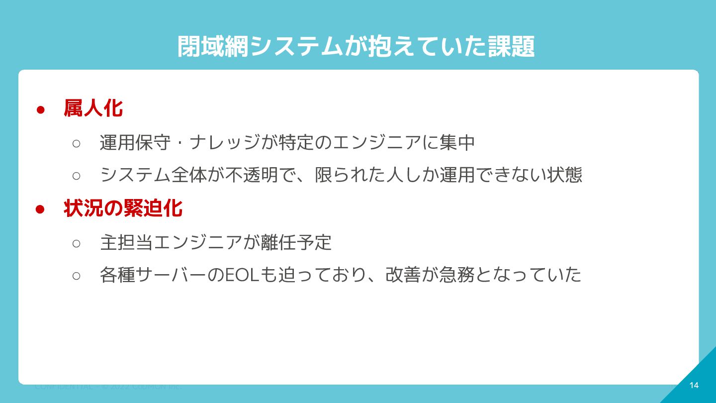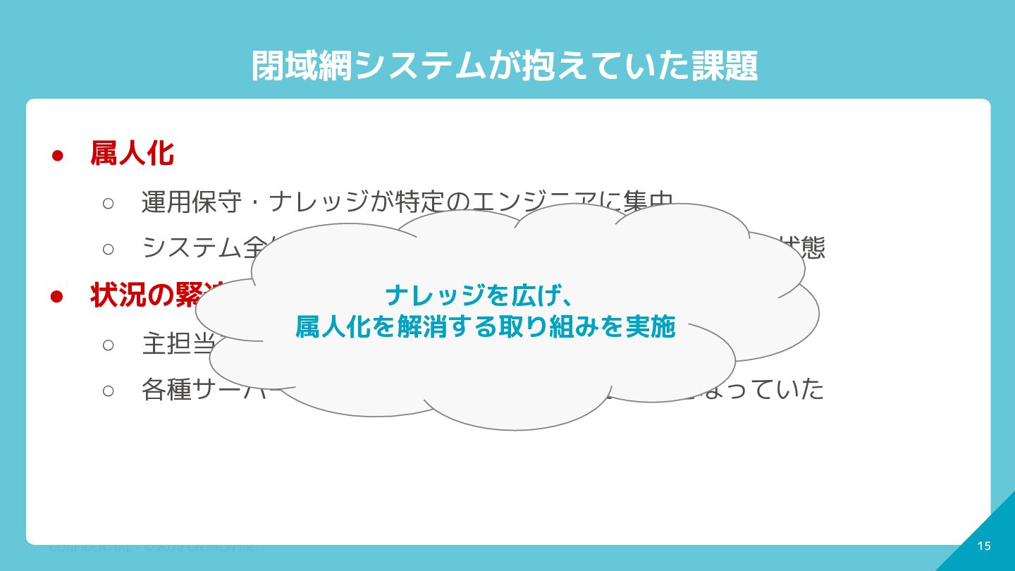 14 CONFIDENTIAL - © 2022 CoDMON Inc. 14 閉域網システムが抱えていた課題 •
