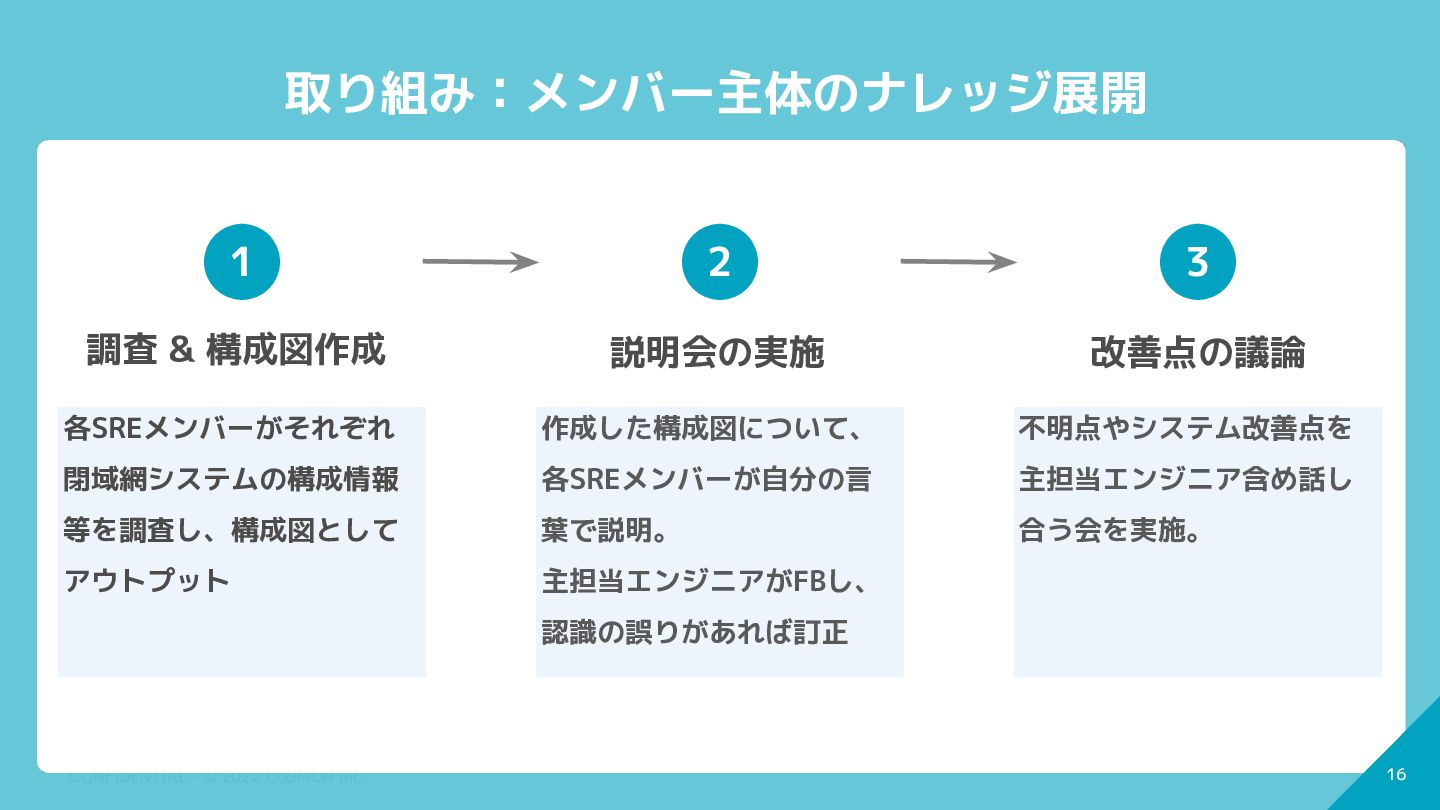 閉域網システムの構成情報 等を調査し、構成図として アウトプット 作成した構成図について、 各SREメンバーが自分の言 葉で説明。 主担当エンジニアがFBし、 認識の誤りがあれば訂正 不明点やシステム改善点を 主担当エンジニア含め話し 合う会を実施。 1 調査 & 構成図作成 2 説明会の実施 3 改善点の議論