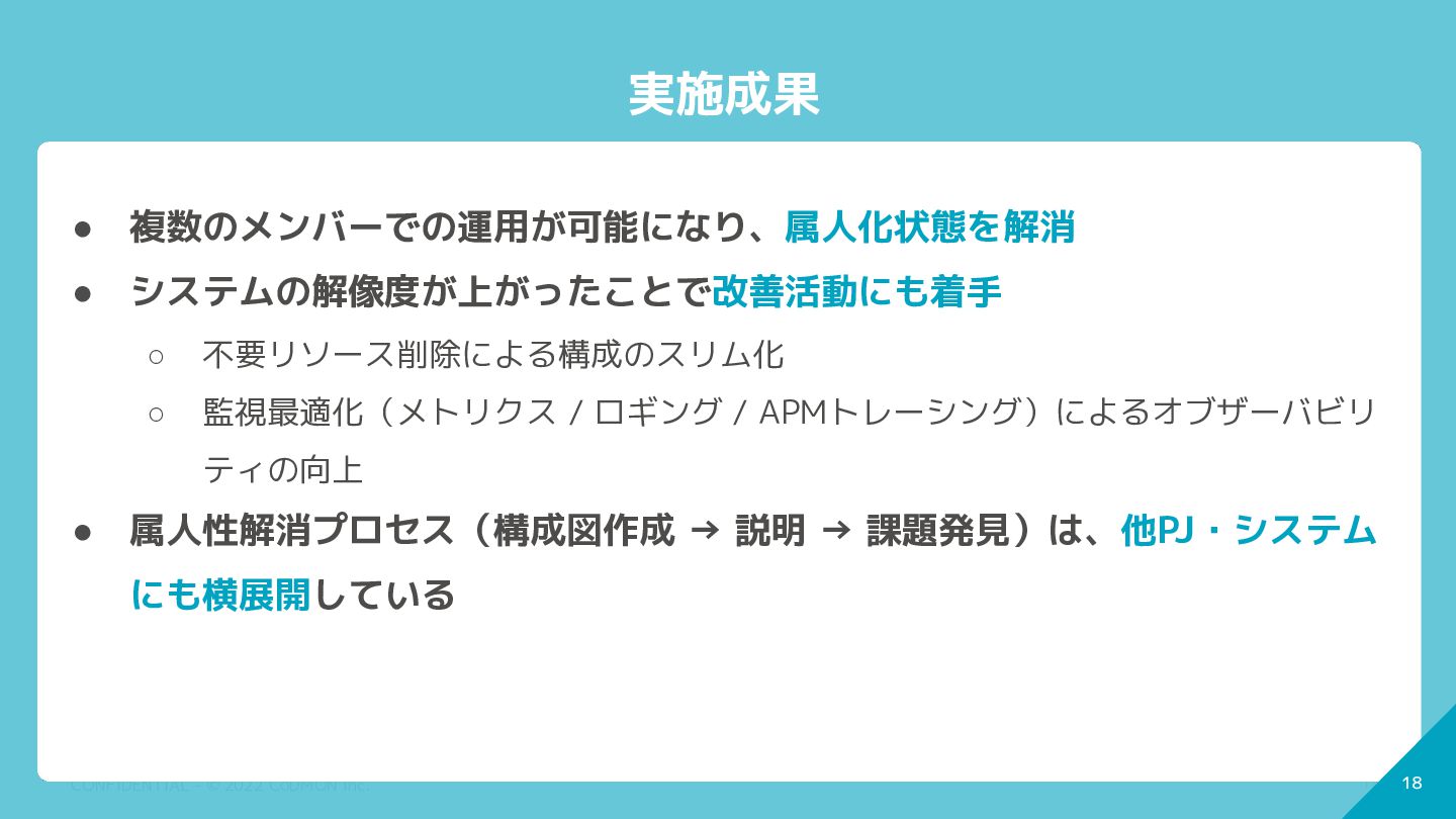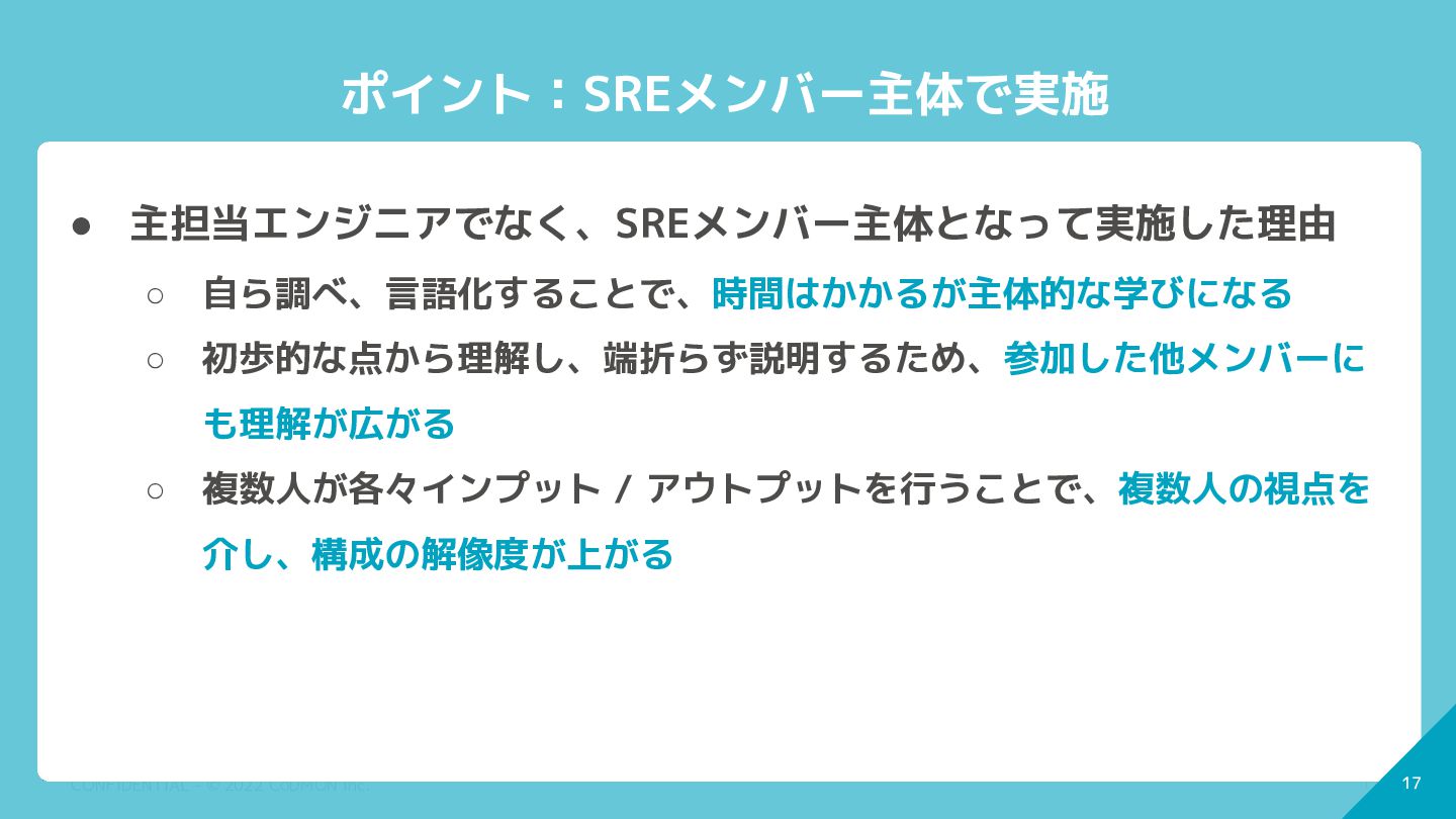 17 CONFIDENTIAL - © 2022 CoDMON Inc. 17 ポイント:SREメンバー主体で実施 •