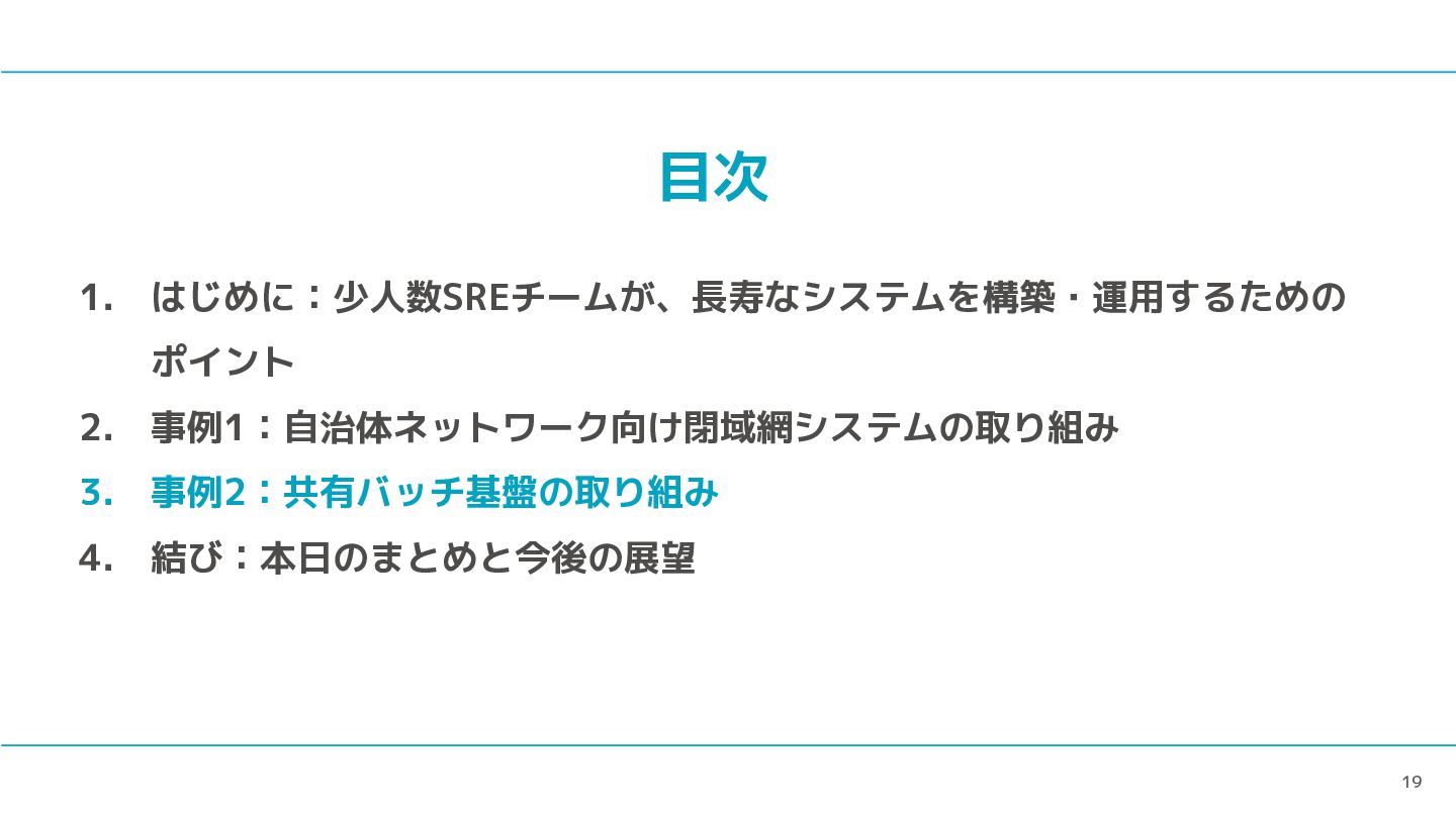 19 目次 1. はじめに:少人数SREチームが、長寿なシステムを構築・運用するための ポイント 2. 事例1:自治体ネットワーク向け閉域網システムの取り組み 3. 事例2:共有バッチ基盤の取り組み 4.