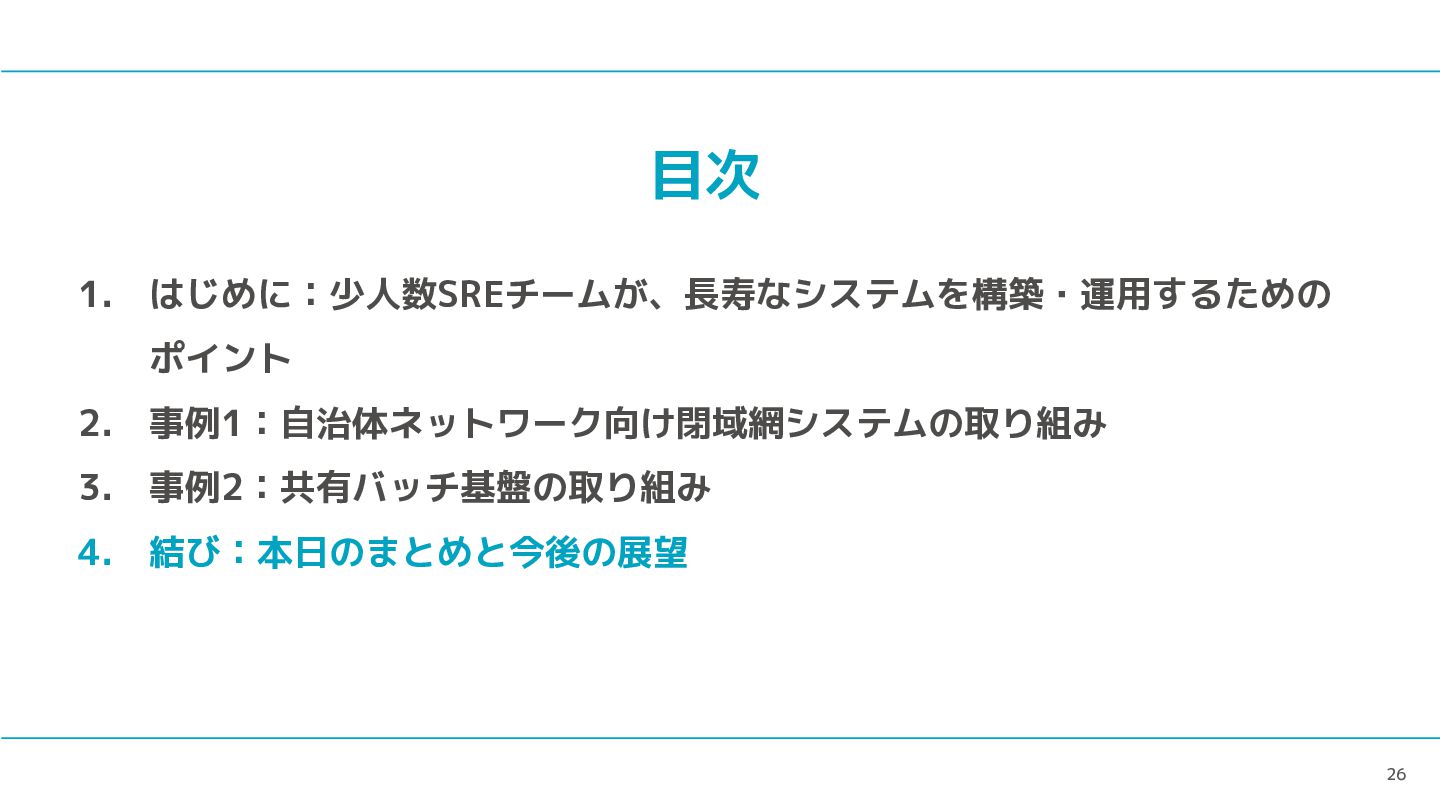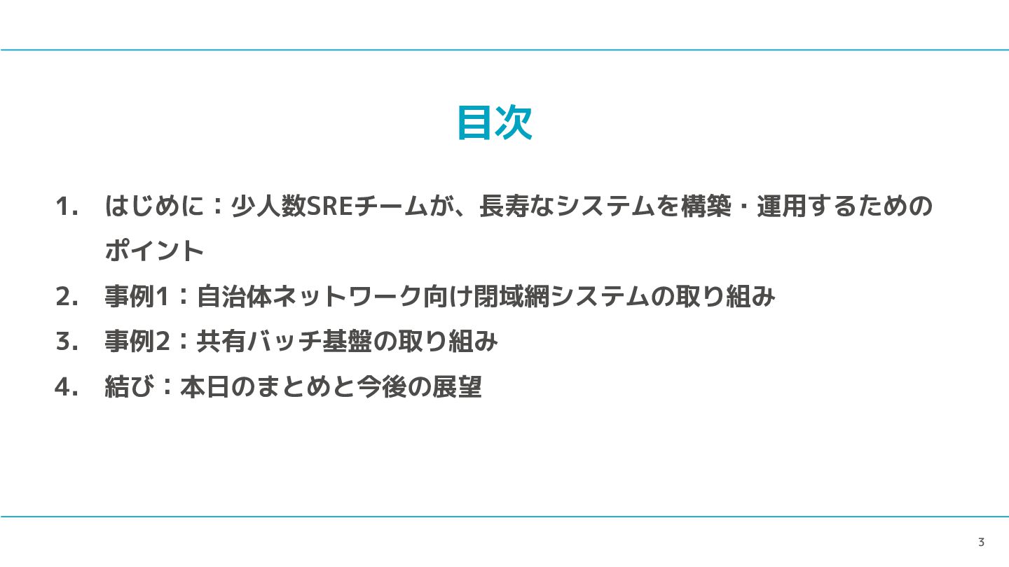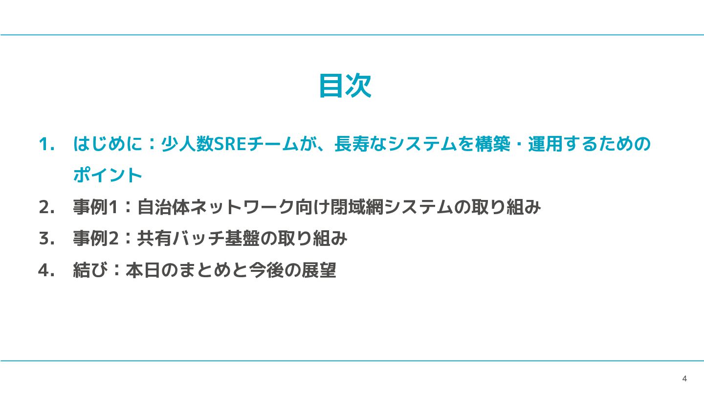 3 目次 1. はじめに:少人数SREチームが、長寿なシステムを構築・運用するための ポイント 2. 事例1:自治体ネットワーク向け閉域網システムの取り組み 3. 事例2:共有バッチ基盤の取り組み 4.