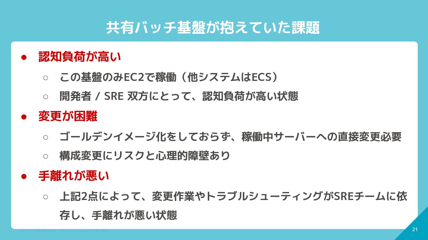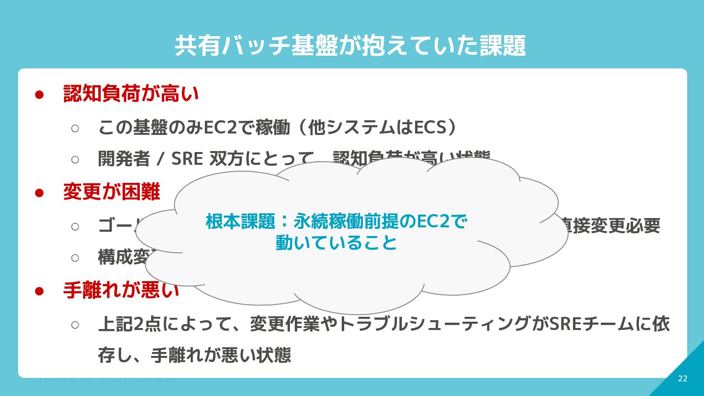 21 CONFIDENTIAL - © 2022 CoDMON Inc. 21 共有バッチ基盤が抱えていた課題 •
