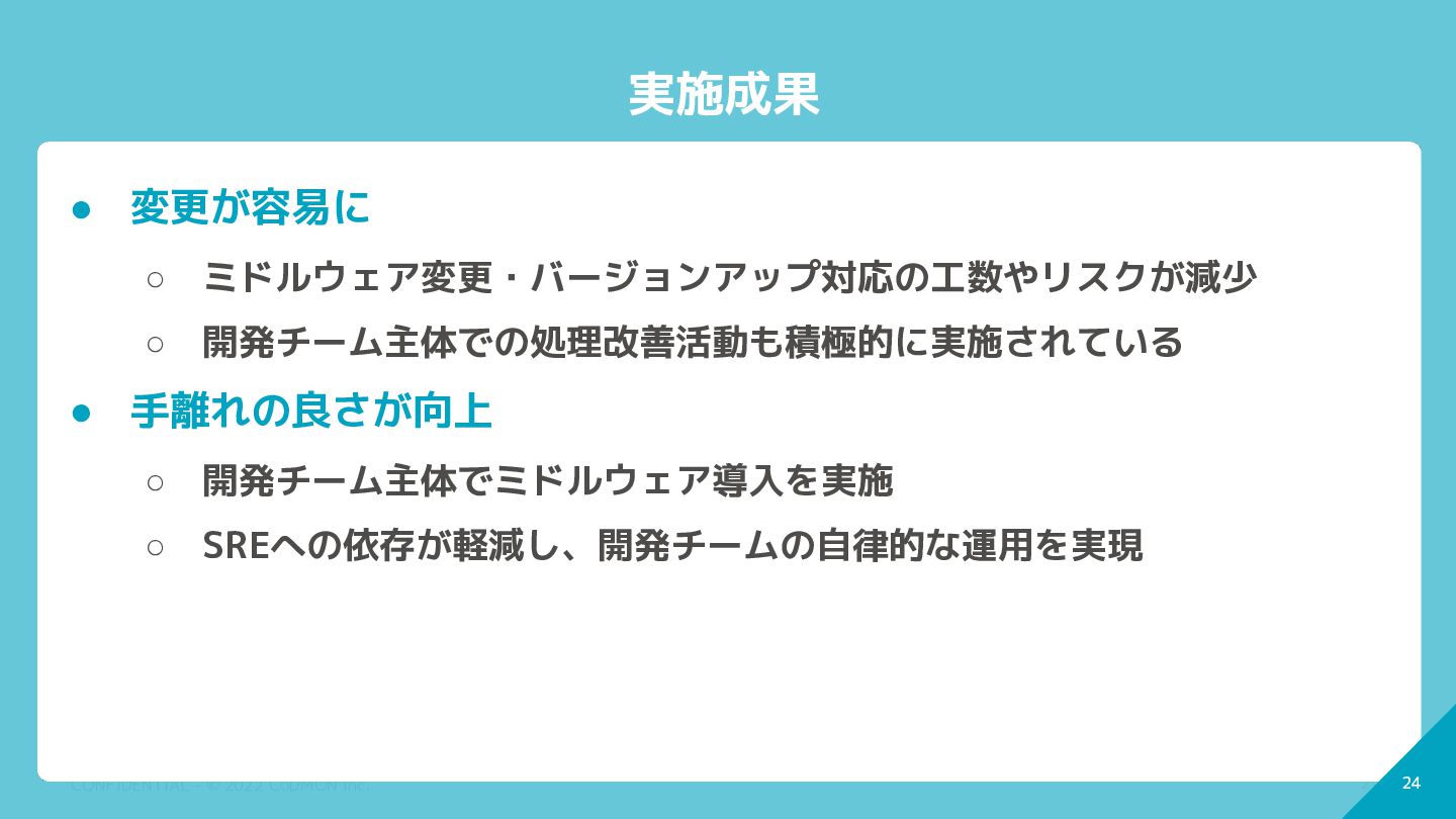 変更が容易に ◦ ミドルウェア変更・バージョンアップ対応の工数やリスクが減少 ◦ 開発チーム主体での処理改善活動も積極的に実施されている • 手離れの良さが向上 ◦ 開発チーム主体でミドルウェア導入を実施 ◦ SREへの依存が軽減し、開発チームの自律的な運用を実現