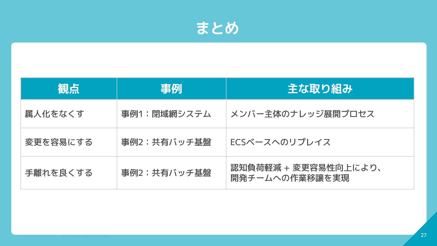 27 CONFIDENTIAL - © 2022 CoDMON Inc. 27 まとめ 観点