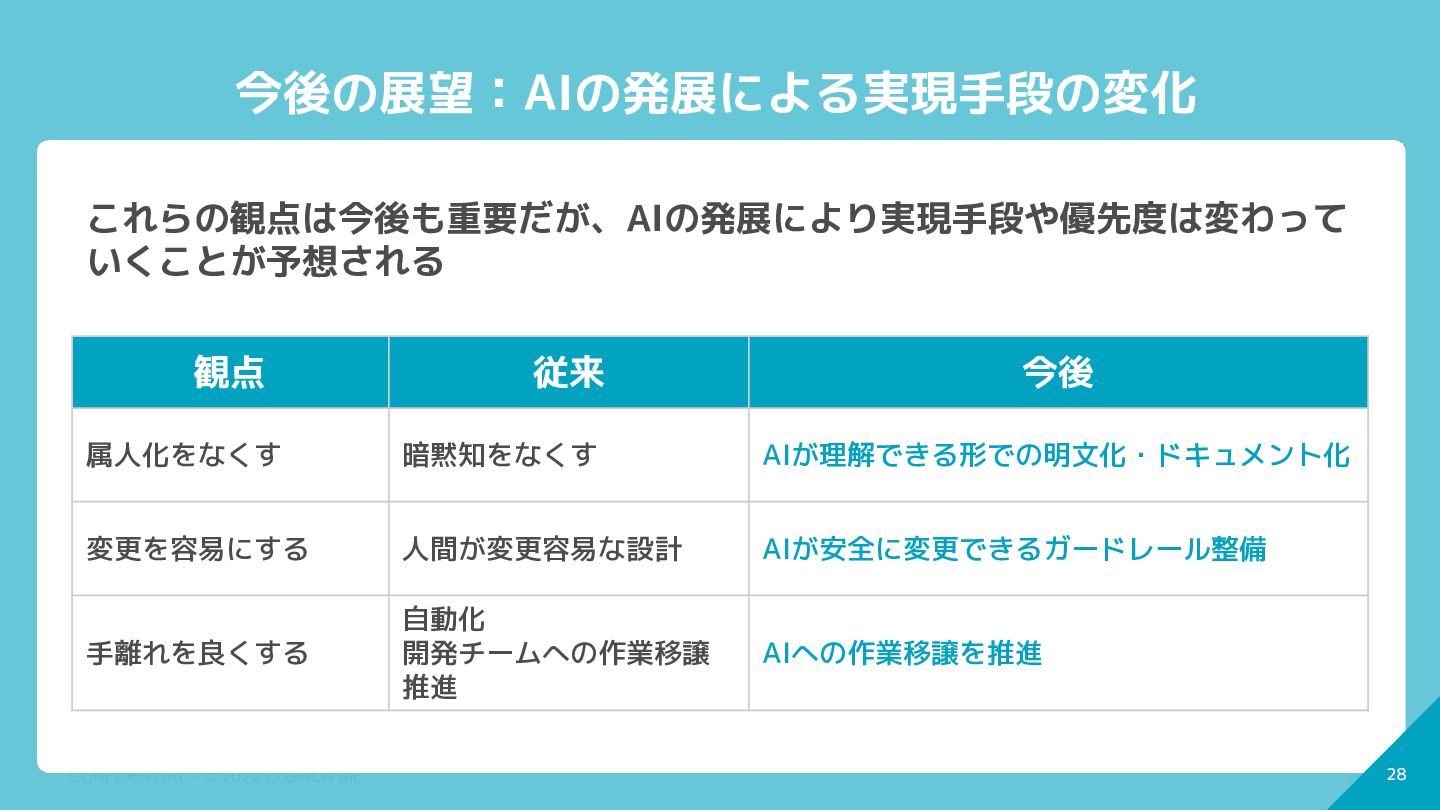 従来 今後 属人化をなくす 暗黙知をなくす AIが理解できる形での明文化・ドキュメント化 変更を容易にする 人間が変更容易な設計 AIが安全に変更できるガードレール整備 手離れを良くする 自動化 開発チームへの作業移譲 推進 AIへの作業移譲を推進 これらの観点は今後も重要だが、AIの発展により実現手段や優先度は変わって いくことが予想される