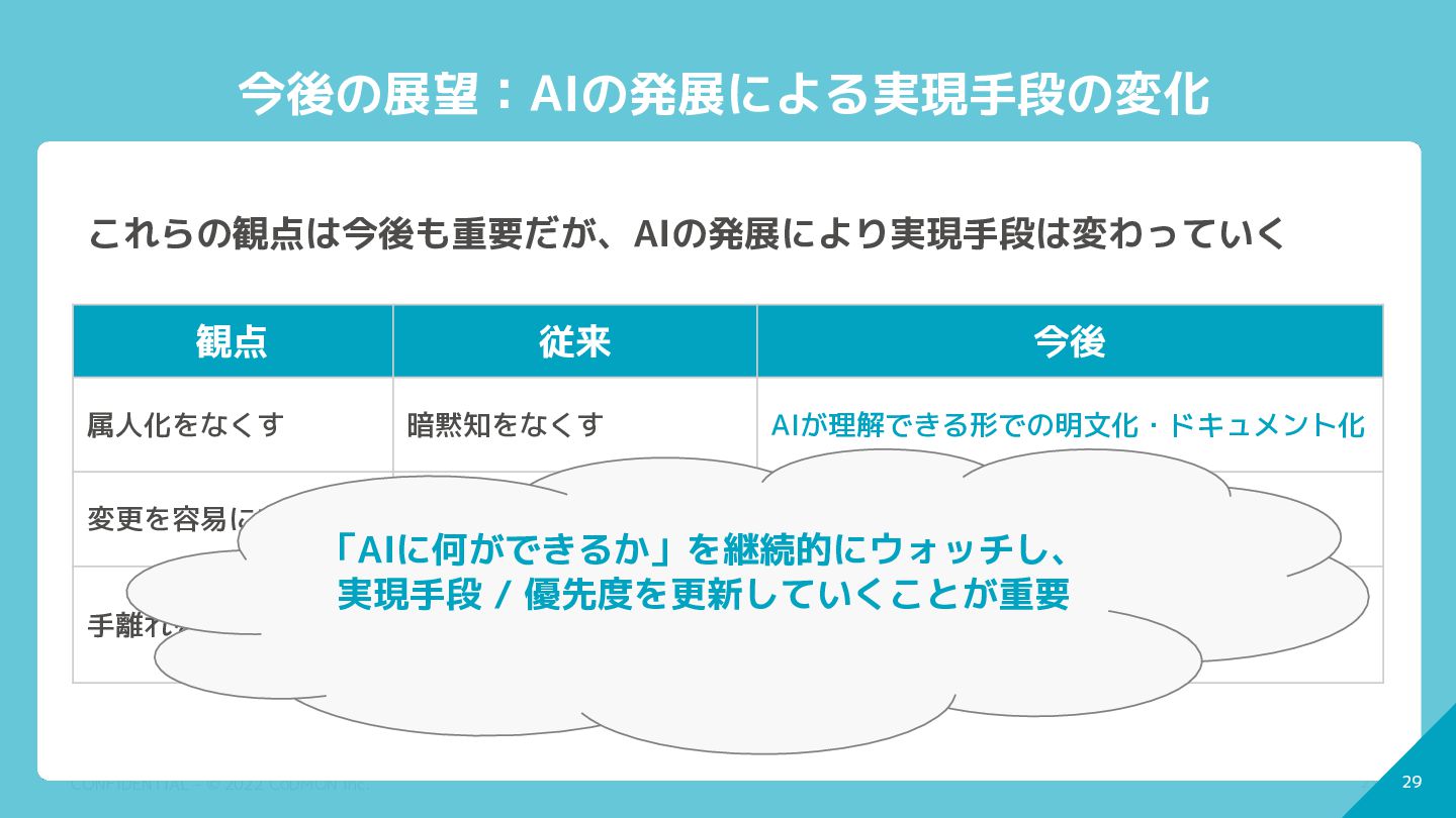 28 CONFIDENTIAL - © 2022 CoDMON Inc. 28 今後の展望:AIの発展による実現手段の変化 観点