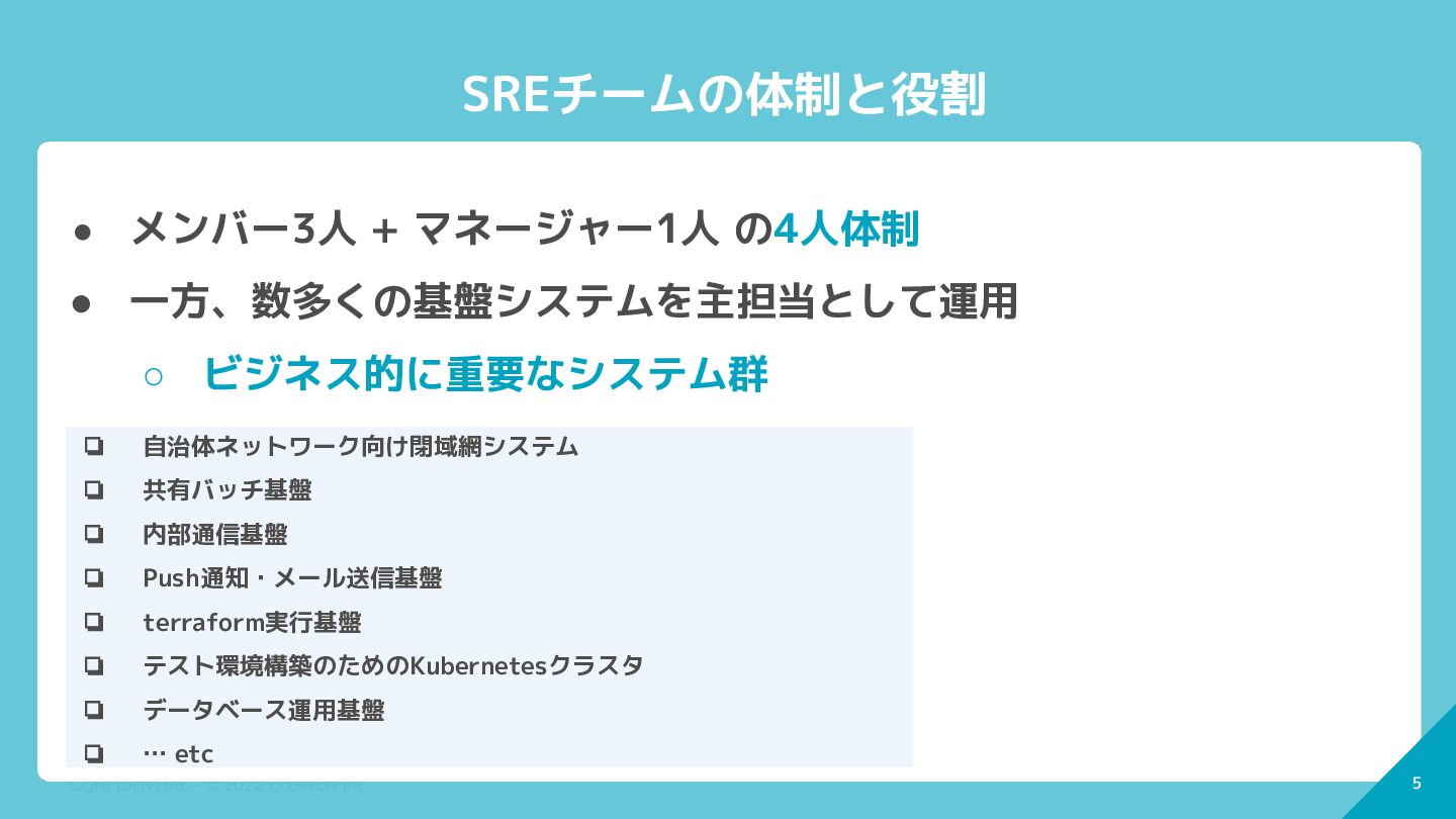 5 CONFIDENTIAL - © 2022 CoDMON Inc. 5 SREチームの体制と役割 •