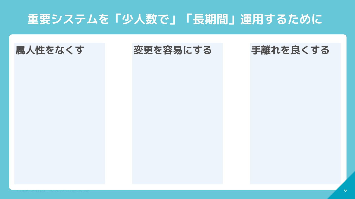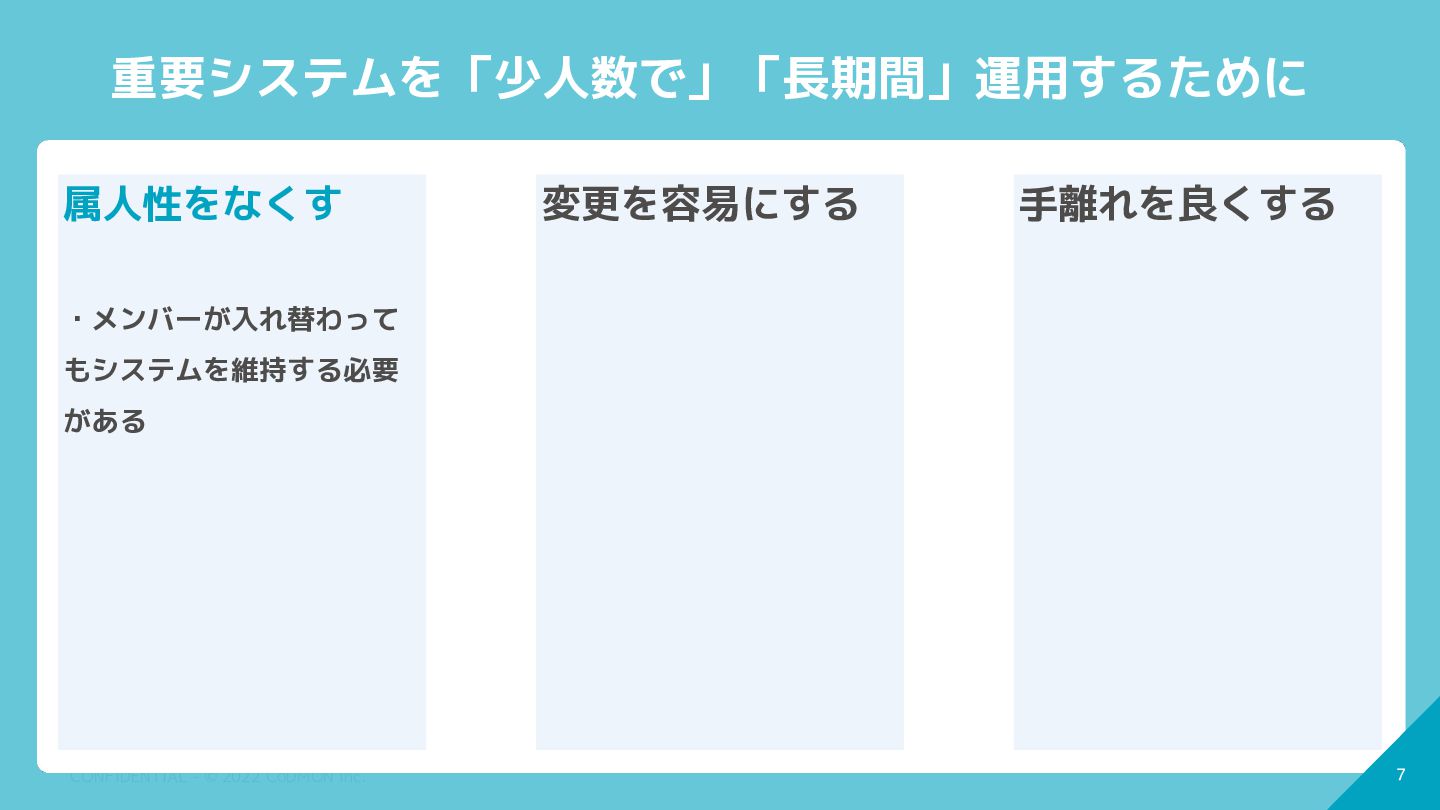 6 CONFIDENTIAL - © 2022 CoDMON Inc. 6 重要システムを「少人数で」「長期間」運用するために 属人性をなくす
