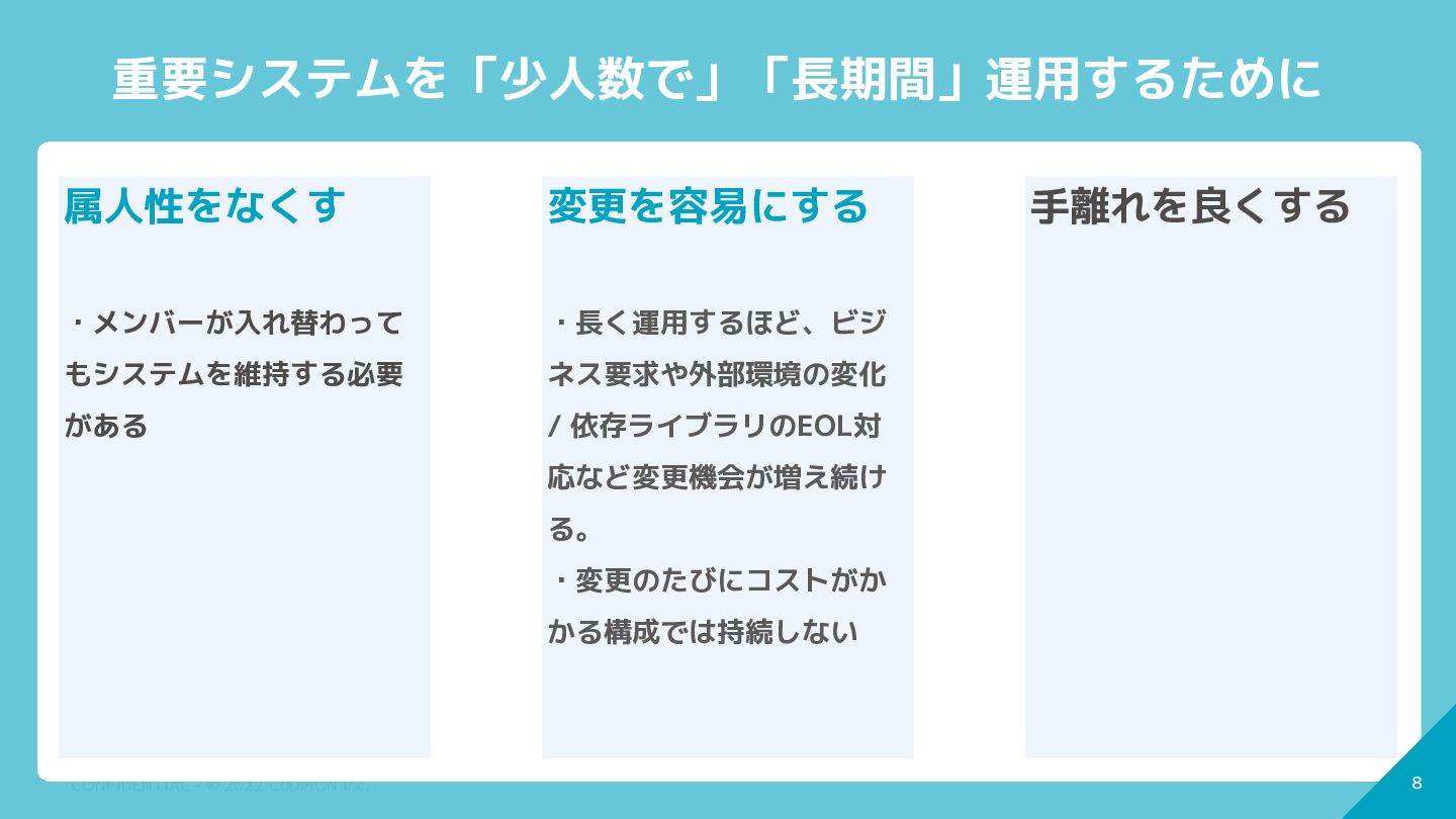 7 CONFIDENTIAL - © 2022 CoDMON Inc. 7 重要システムを「少人数で」「長期間」運用するために 属人性をなくす