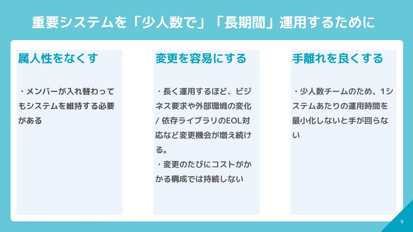 8 CONFIDENTIAL - © 2022 CoDMON Inc. 8 重要システムを「少人数で」「長期間」運用するために 属人性をなくす