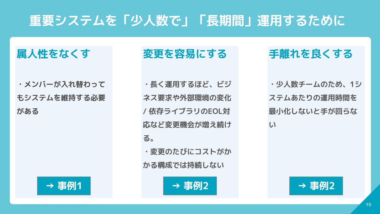 9 CONFIDENTIAL - © 2022 CoDMON Inc. 9 重要システムを「少人数で」「長期間」運用するために 属人性をなくす