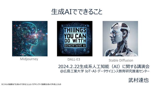 2024.2.22⽣成系⼈⼯知能(AI)に関する講演会 @広島⼯業⼤学 IoT・AI・データサイエンス教育研究推進センター 武村達也 ⽣成AIでできること Midjourney DALL-E3 Stable Diffusion ※これらの画像は「生成AIでできること」というプロンプトで画像生成AIで作成したもの