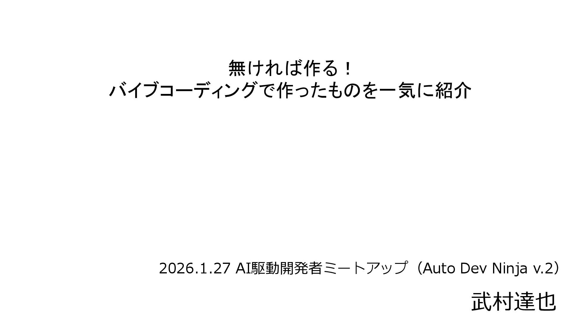 2026.1.27 TechGALAのサイドイベント「AI駆動開発者ミートアップ(Auto Dev Ninja v.2)」 https://base.timewell.jp/events/7df9519c-6935-4562-9bb6-b9766aab297a