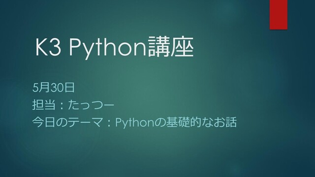 K3 Python講座 5月30日 担当:たっつー 今日のテーマ:Pythonの基礎的なお話