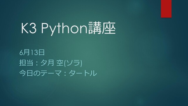 K3 Python講座 6月13日 担当:夕月 空(ソラ) 今日のテーマ:タートル